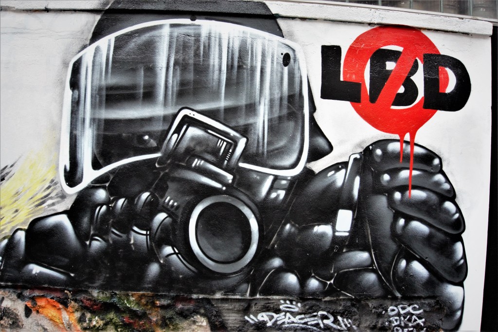 Les armes non seulement sont représentées mais sont devenues des sujets : les grenades de désencerclement et les lanceurs de balles de défense. La représentation des armes est symptomatique de leur importance dans les