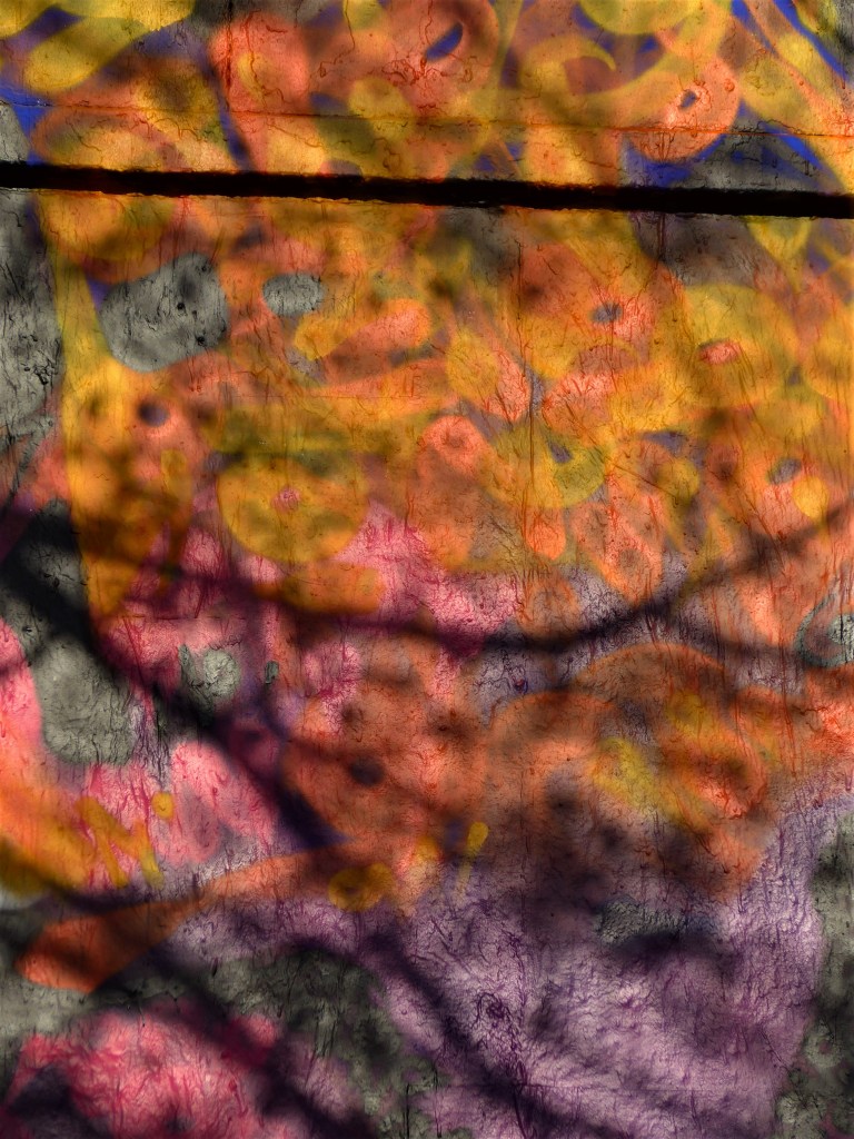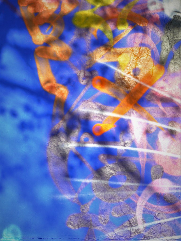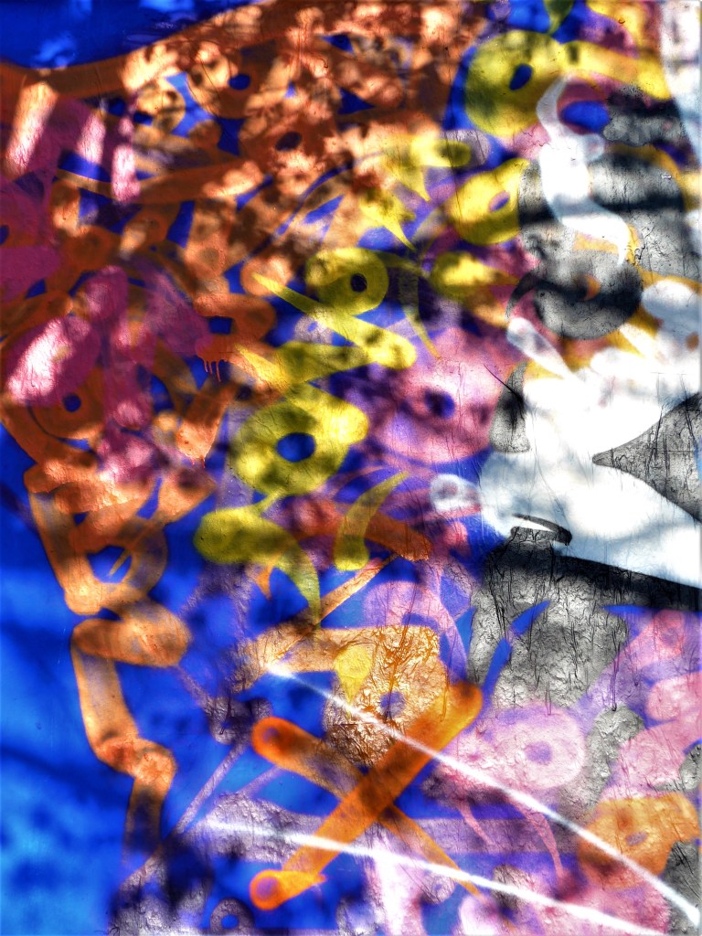 Son utilisation des calligraphes signe ses œuvres. Lui seul sait peindre de cette manière, en dansant devant son support. En apportant des calligraphes roses à gauche de la tête, fins pour mieux se fondre dans le fond, qui se recule, prend du champ pour avoir une vision plus générale de l’œuvre, prend une bombe, équilibre son rose du côté droit. Cela dure…le temps nécessaire pour qu’il ait le sentiment que sa peinture traduise le volume et concilie réalisme et abstraction.