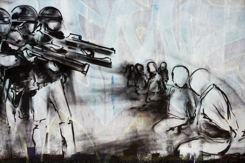Depuis 2018, Itvan Kebadian peint en collaboration d’autres graffeurs des scènes de tumulte, d’émeutes, d’insurrection, de révolte entre forces de répression et jeunes gens mécontents de l’héritage laissés par leurs ainés. Une société dominée par la recherche du profit, l’accroissement des inégalités, les guerres qui traduisent le choc des impérialismes, l’exacerbation des nationalismes…Bref, un monde qui ne tourne pas rond et qu’il faut changer.
