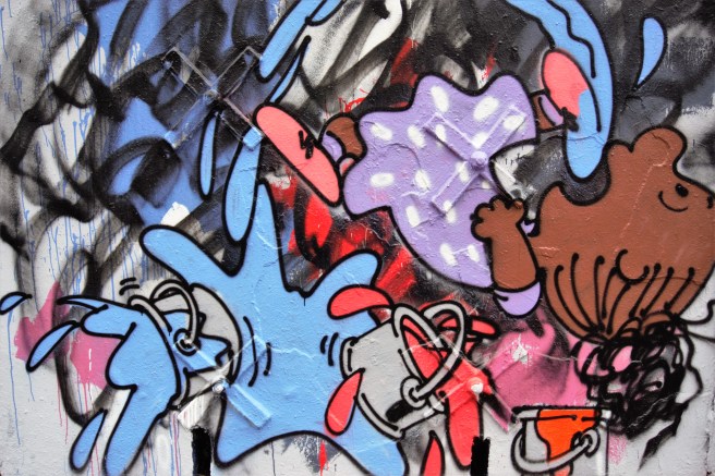 Un autre intérêt du strip de FD crew, c’est le rapport entre le street art et l’humour. Les œuvres drôles sont relativement rares ; elles le sont parfois à leur corps défendant ! Elles utilisent davantage le deuxième degré, l’ironie, la caricature etc. Difficile d’être pris « au sérieux » avec une œuvre drôle ! Alors on fait dans la « déco », la fresque à message, la belle ouvrage !
