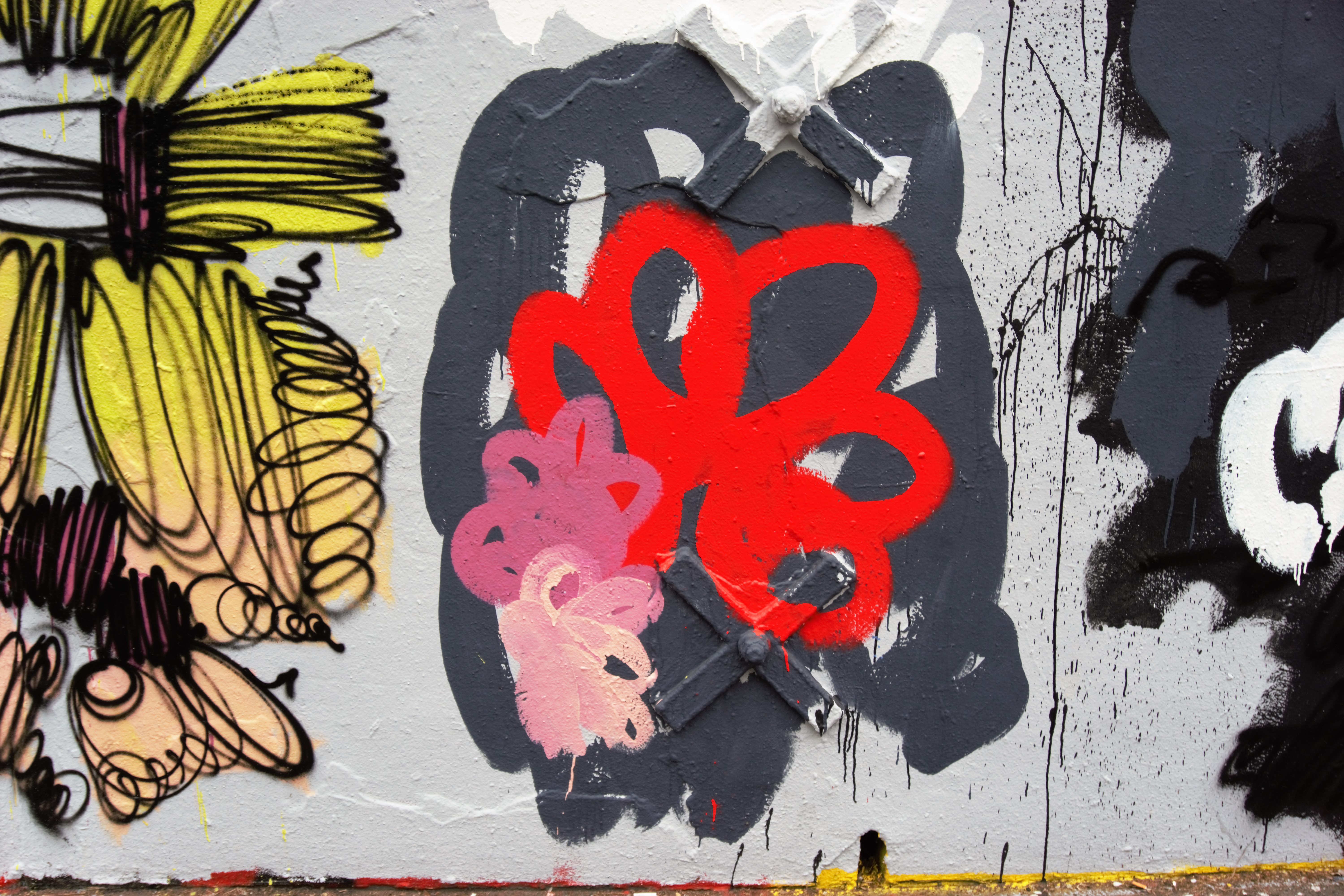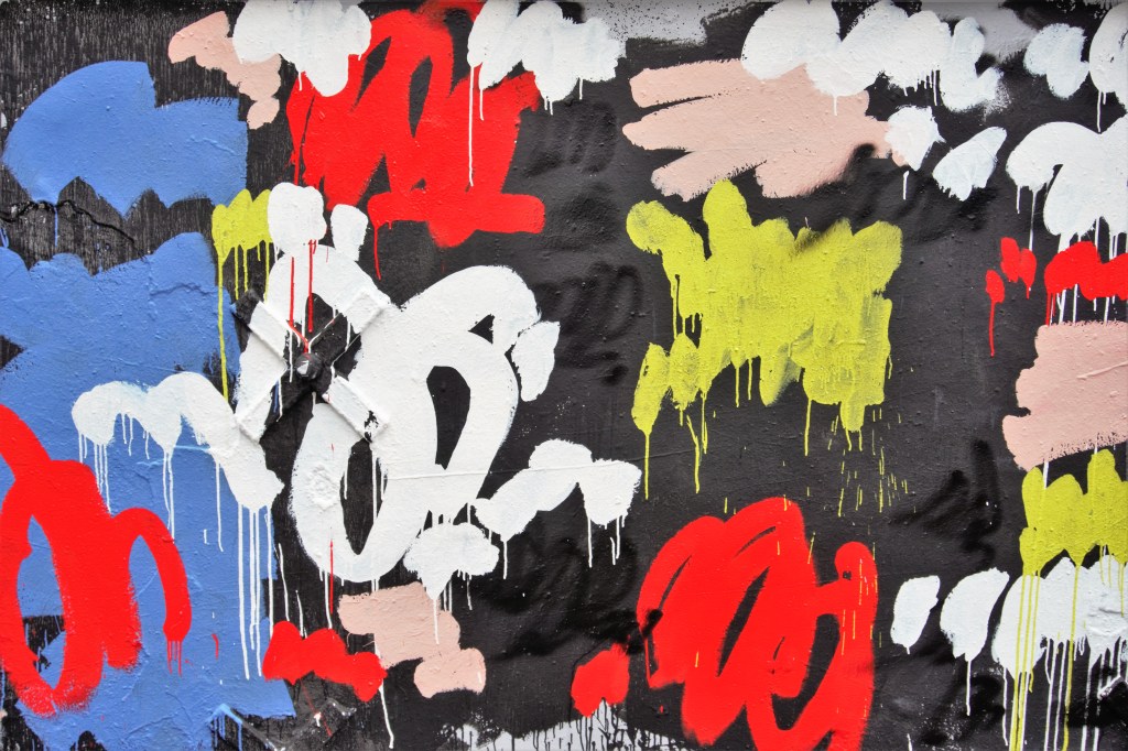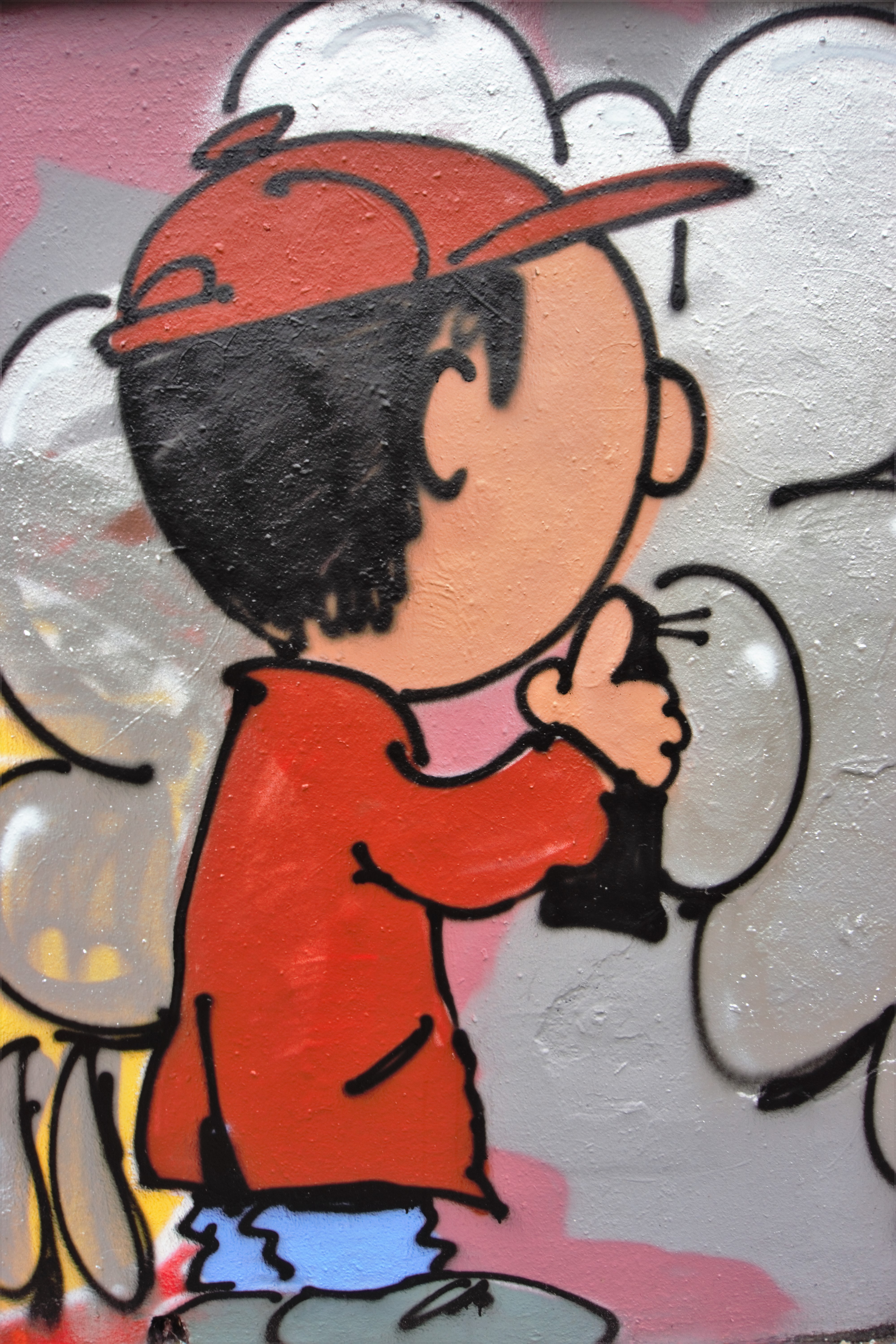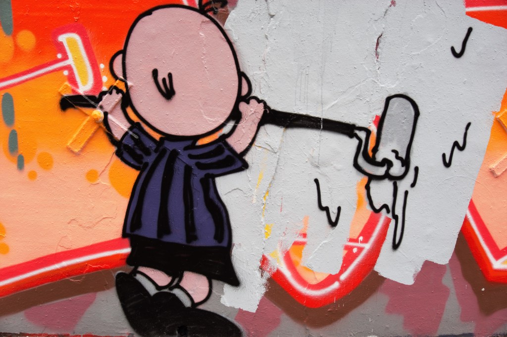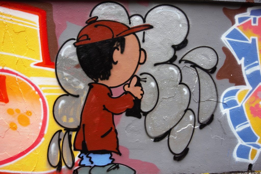 Schulz n’aurait pas renié le strip de FD crew. Les cases caractéristiques de la bande dessinée ont été certes supprimées mais la composition de la fresque renvoie précisément à la BD originale, à la différence que le strip peut se lire dans les deux sens, de droite à gauche et de gauche à droite. Six saynètes structurent le strip. On y retrouve les Peanuts qui peignent le mur. Ils utilisent les outils des street artists : bombe aérosol, rouleau, pinceau. La peinture coule, les « œuvres » tiennent plus du barbouillage que de l’art. Normal, ce sont de jeunes enfants qui peignent et leurs « peintures », comme ils disent, sont celles de jeunes enfants.