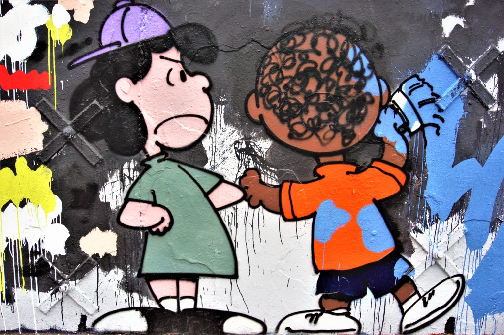 Je crains que certains passants ne possédant pas les codes du strip des Peanuts aient mal interprété le mur du crew. Ils ont pris les gribouillis au premier degré croyant que les artistes du crew avaient fait « n’importe quoi ». Bien sûr, ils n’ont pas trouvé ça drôle ! Il est vrai que Charlie Brown et son inénarrable chien Snoopy sont absents et que les autres personnages ne sont connus que des initiés. Il est vrai également que l’ensemble des personnages connu de tous les enfants des pays anglosaxons est immédiatement reconnu et identifié par ses traits distinctifs. En ce qui concerne la France, c’est certainement beaucoup moins vrai. Quelques personnages sont fameux (Snoopy, Charlie Brown etc.), et des milliers de produits dérivés les représentent. Les autres personnages n’apparaissent qu’épisodiquement dans les bandes dessinées et leur identification est moins immédiate. Le « running gag » est également dans la référence du strip avec d’autres strips du corpus.