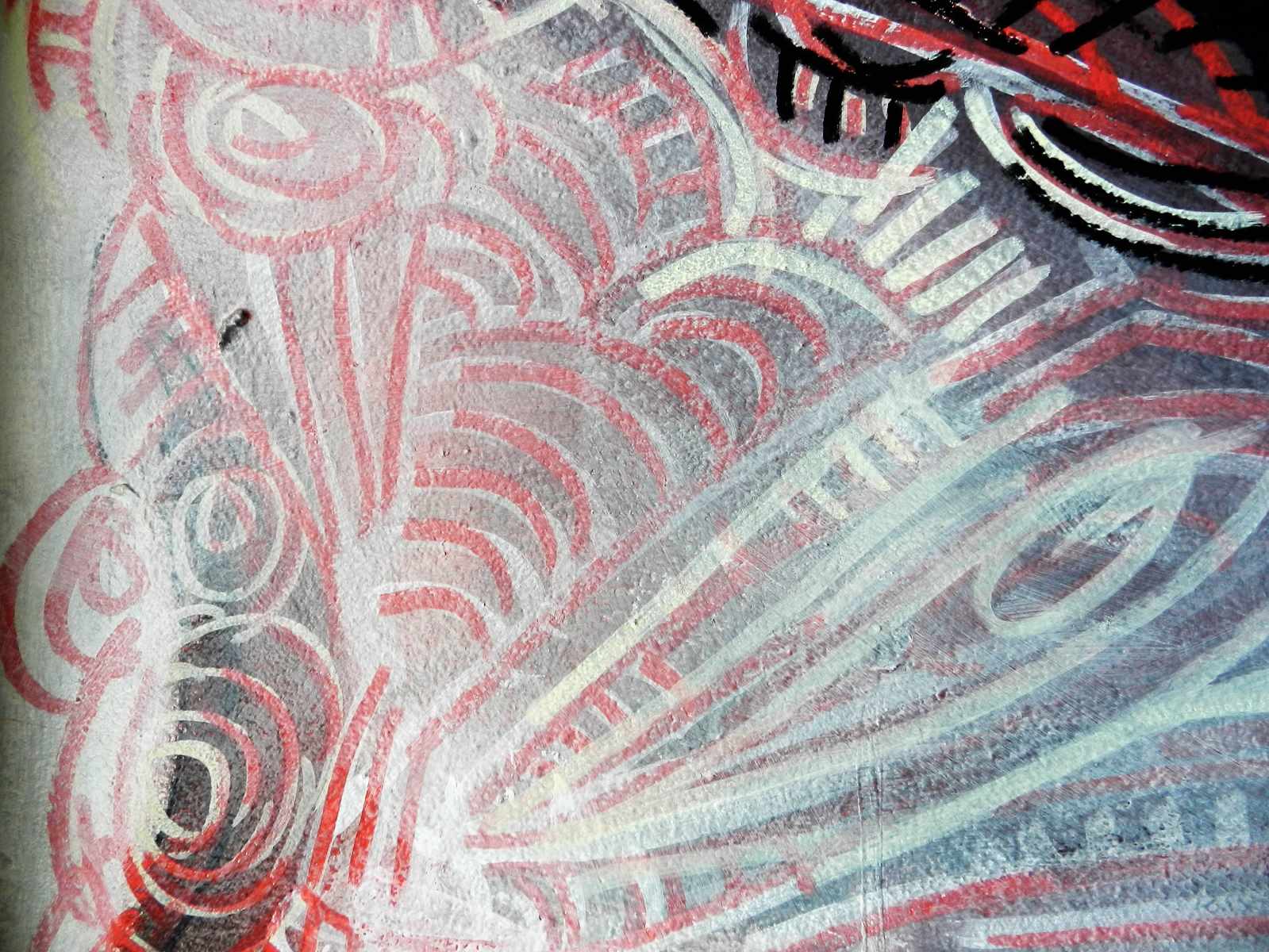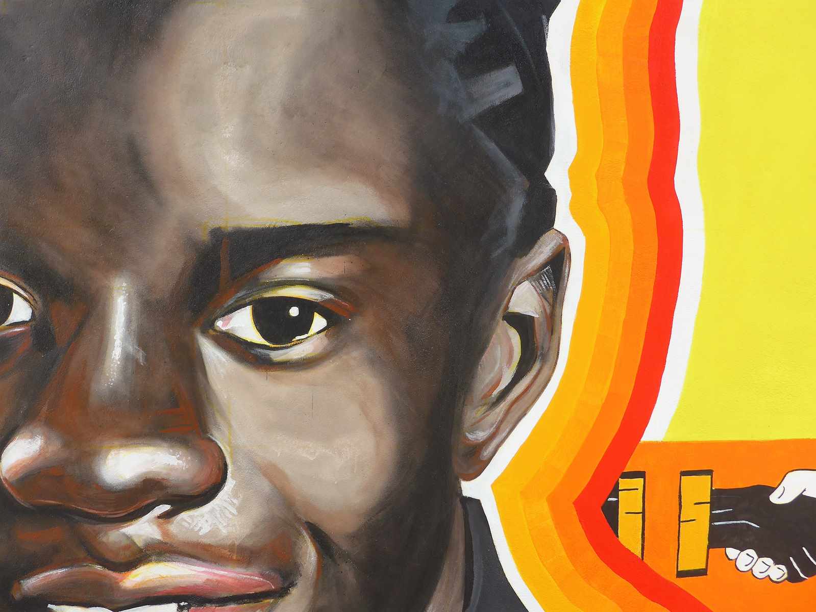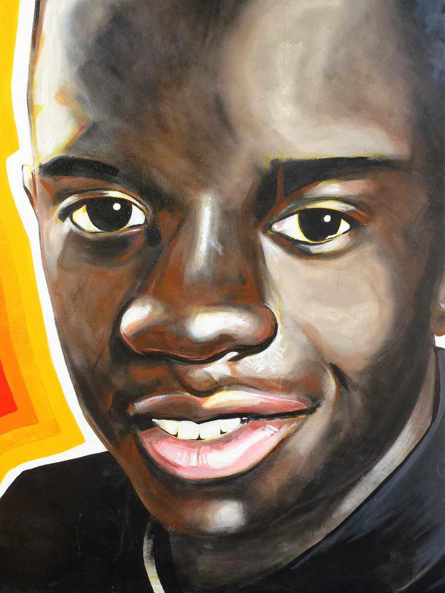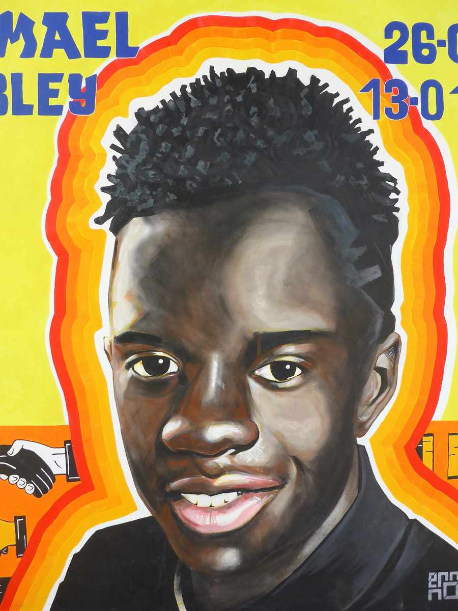 Ernesto Novo a peint un mur qui est, également, un hommage. Mais sa facture est bien différente. Le mur entier forme le cadre. Il est divisé en espaces bien définis : une partie centrale sur laquelle est peinte le portrait ressemblant du jeune garçon, un décor constitué d’une « aura » cernant le visage et d’une partie basse formée de la répétition de motifs semblables, des mains serrées. Le portrait est encadré par deux « colonnes » de motifs, une reprise de l’aura du visage peinte en dents de scie, deux motifs : un micro et un ballon de football. Le visage est surmonté d’un lettrage : l’écriture du nom du jeune garçon et ses dates de vie et de mort (lettrage Sitou Matt). Comme la stèle d’une tombe.