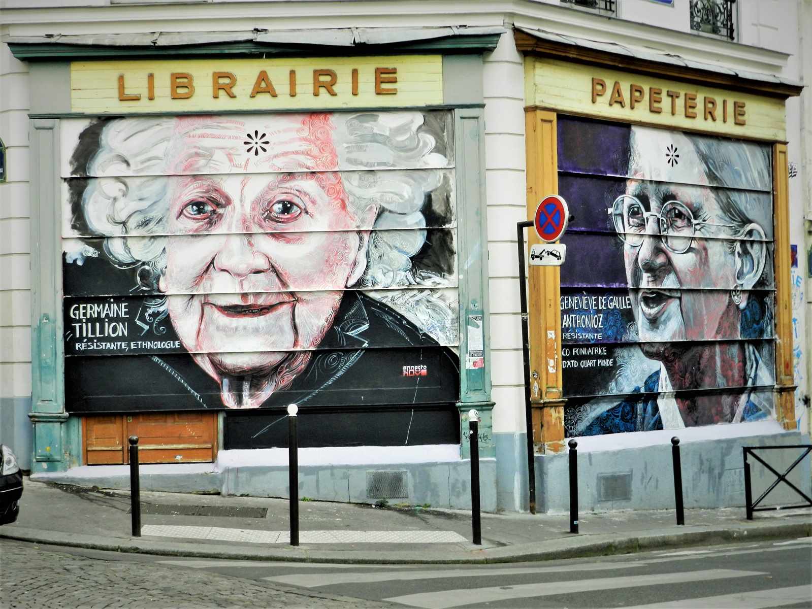 En guise d’introduction au travail d’Ernesto Novo, j’ai choisi deux œuvres et trois portraits. La première œuvre date de 2014. C’est une commande dont l’objet était de célébrer l’entrée au Panthéon en 2015 de deux grandes dames, Germaine Tillion et Mme De Gaulle- Anthonioz, deux femmes résistantes enfin reconnues dignes de figurer dans le panthéon national. Leurs cercueils rejoignaient alors ceux de Sophie Berthelot et de Marie Curie. Pour la première fois, deux femmes étaient panthéonisées pour des faits de résistance pendant la Seconde guerre mondiale. L’événement était là ; dans la reconnaissance du rôle des femmes dans la Résistance. Leurs portraits ont été peints sur les rideaux de fer d’une librairie-papeterie fermée depuis des lustres, à l’angle de la rue de Tortille et la rue Ramponneau, dans le quartier populaire de Belleville.