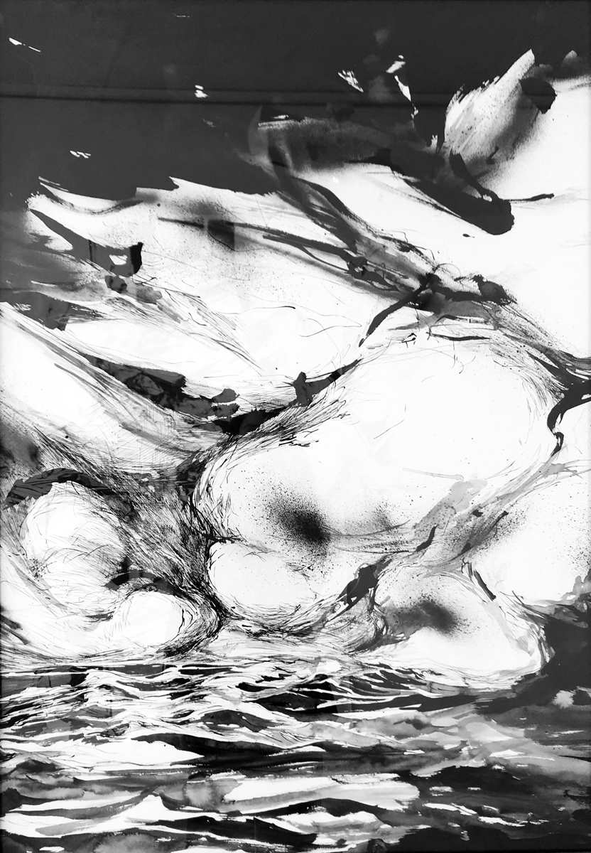 Ne vous attendez pas à admirer des paysages bucoliques, vertes prairies, fleurs sauvages, petits oiseaux, couchers de soleil. Les paysages d’Itvan Kebadian sont bien davantage des scènes. Des « mises en scène » de personnages et d’éléments. Les « plans larges » sont des arrêts sur image de personnages confrontés à d’autres personnages, soit à des éléments qui les dominent et les écrasent. L’encre de Chine est noire. Les œuvres des dessins noirs sur fond blanc, un peu comme les fresques peintes « dans la rue ». Parfois, dans le tumulte, la fuite, le désordre, des nuées, à moins que cela ne soit des fumées. Des explosions s’élèvent de surnaturelles fleurs rouges. Rouges certes comme le sang versé, mais signe d’un espoir qui se lève, enfin.
