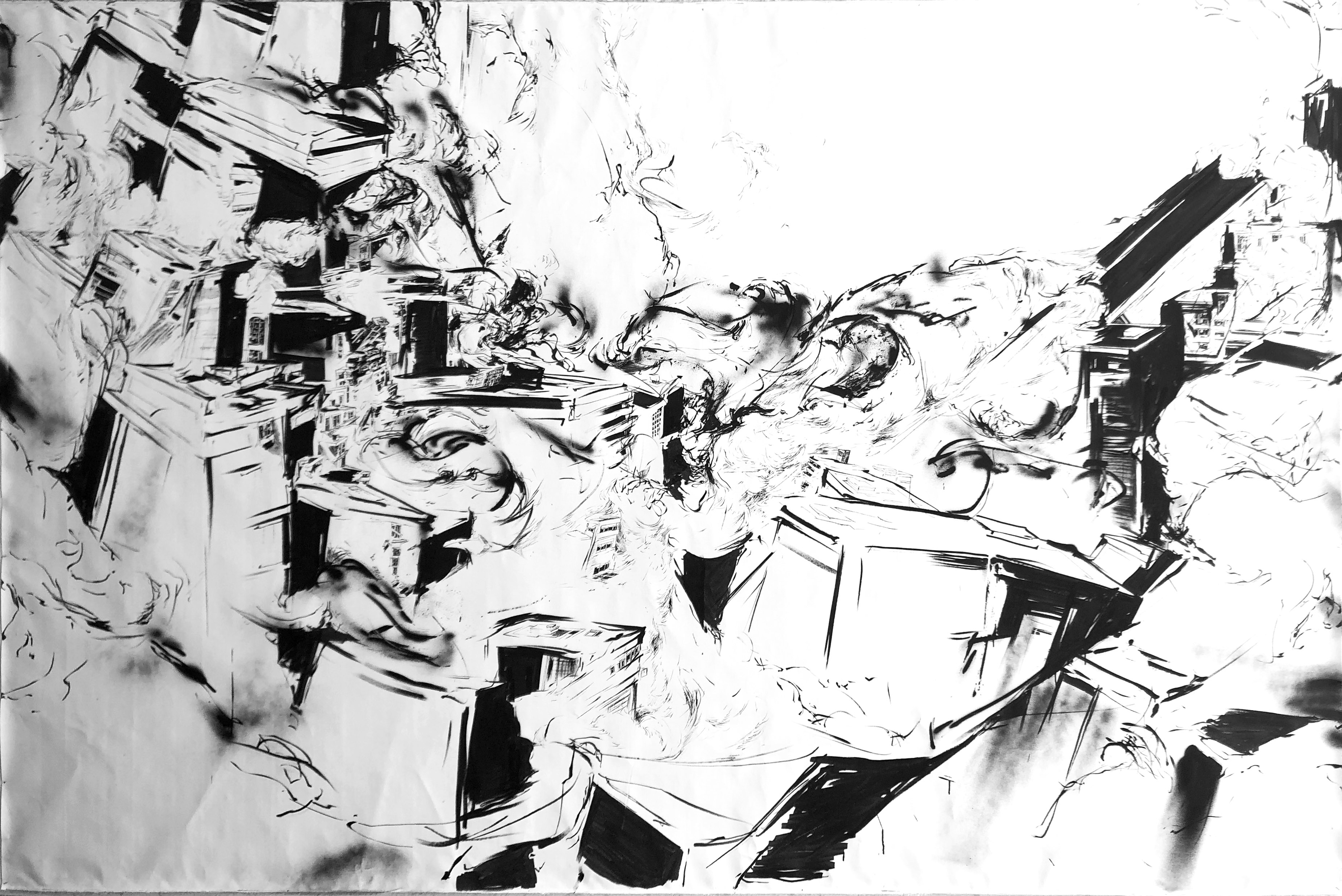 Les paysages d’Itvan Kebadian sont des paysages intérieurs. Verlaine aurait dit que son « âme est un paysage choisi ». Un paysage noir avec à l’horizon une faible lueur d’espoir. Un paysage dévasté, ruiné, tourmenté. Entre le graffiti, les Black Lines et ses paysages, de nombreux points communs : il s’agit de la même « âme ». Des différences pourtant, dans la forme. Les vapeurs, les pesants nuages, les toxiques fumées, qui sont bien davantage des gaz que des matières sont rendus, accèdent à l’existence, grâce à des réseaux de traits. Leur nombre et leur finesse traduisent ce qui n’existent presque pas. Ces réseaux d’une grande densité alternent avec des surfaces d’un noir de jais. Le trait s’oppose à la surface, comme le malheur à l’espoir.