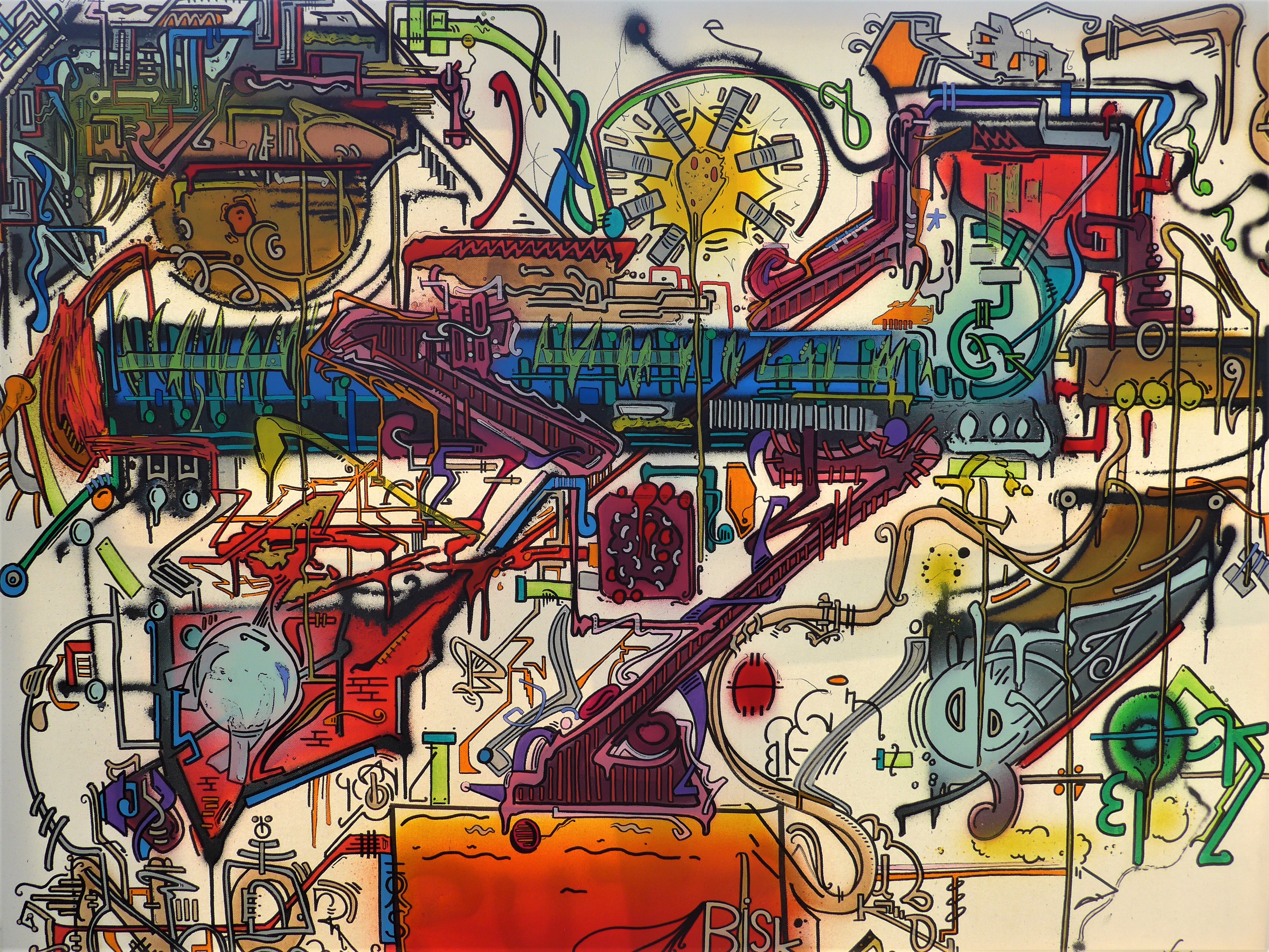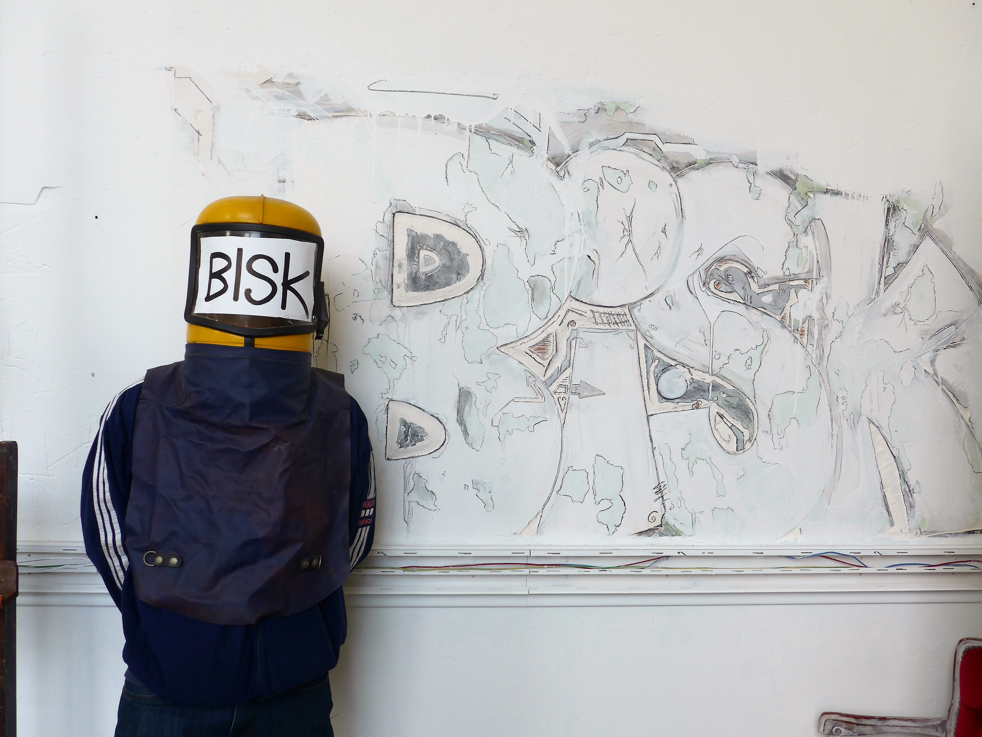 Dans le fond d’une salle grande comme un terrain de football, Bisk travaille sur ses toiles de grandes dimensions. Vous n’y trouverez pas la fameuse palette de l’artiste-peintre, les bocaux pleins de pinceaux, etc., car le matériel d’un street artist est, nécessité fait loi, aisément transportable : des bombes aérosols, des feutres, éventuellement, pinceaux, brosses, rouleaux. Un matos qui tient dans un grand sac de sport, pour rapidement effectuer un repli tactique quand arrive la maison Poulagas, pour aller d’un local à un autre, d’un spot à un autre. Une contrainte forte quand même, il faut de la lumière et il reste vrai que la lumière du jour est préférable. Elle se diffuse dans l’espace du local, ne dénature pas les couleurs. Bref, espace et lumière, pour le reste, on fait avec !