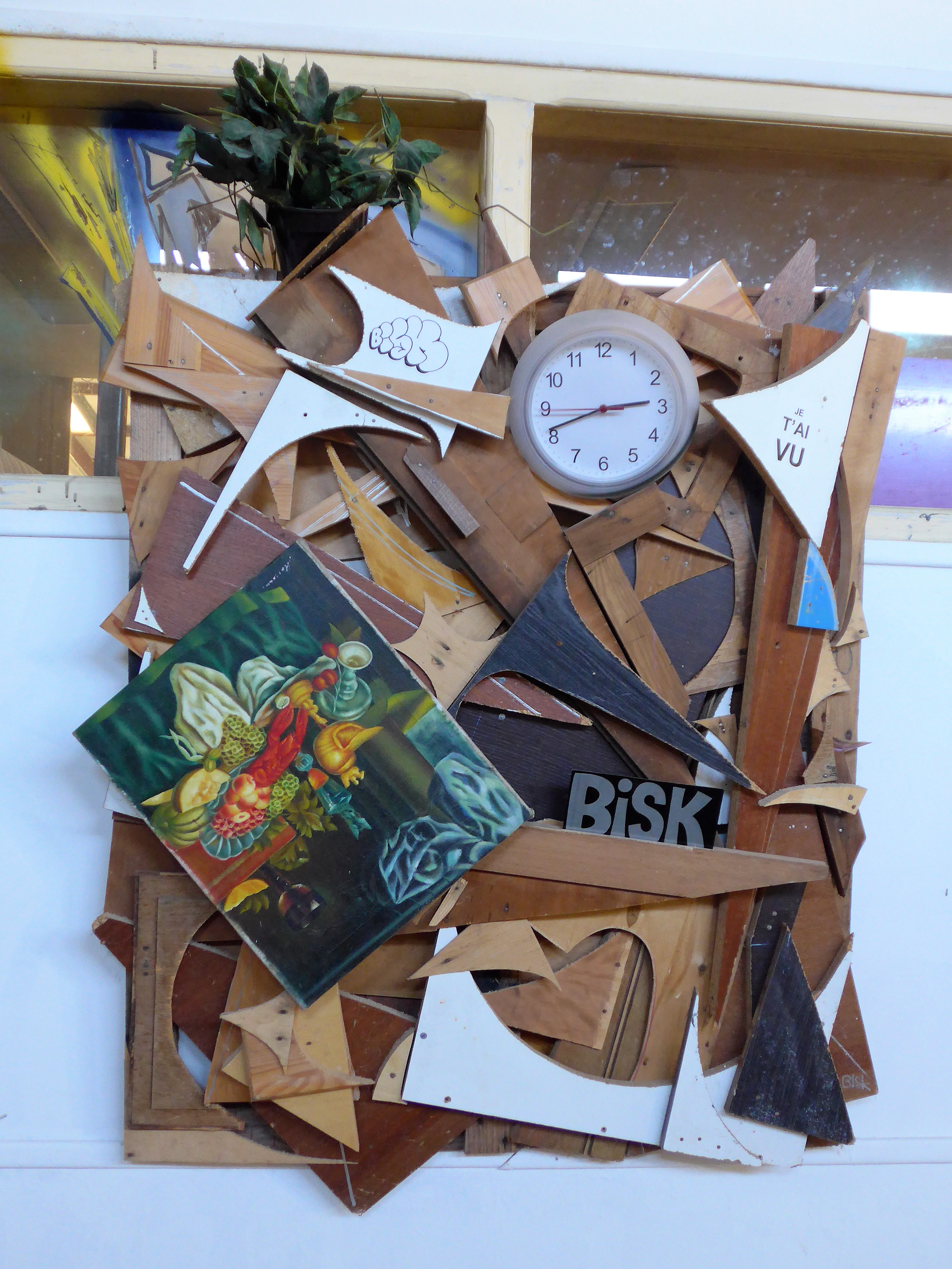 Partant du premier niveau du local, j’ai le sentiment que je remonte le temps : celui de la carrière de Bisk. La grande salle donne un bon exemple de son travail actuel. Des toiles de dimensions variables qui illustrent sa manière actuelle de peindre. Une accumulation de formes et de couleurs ponctuée par le graff de son blaze en jouant sur différents lettrages. Dans les couloirs, Bisk a accroché des ready-made. Bien que fort variés, ils sont composés de matériaux récupérés accumulés structurés par une composition savante qui privilégie au volume un espace en deux dimensions. Ces œuvres comme les toiles récentes de l’artiste sont fondées sur l’intérêt plastique des accumulations d’objets. Se mêlent deux concepts : celui de la collection et celui de l’insolite.