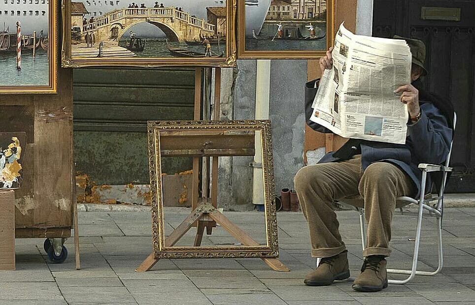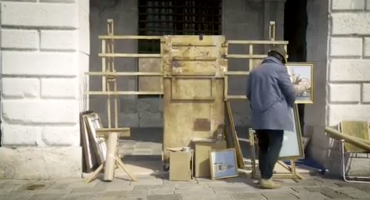 Venise, la ville-musée, patrimoine de l’humanité, ses gondoles, sa biennale, « l’événement artistique le plus grand et le plus prestigieux du monde », et un petit monsieur, manteau sur les épaules, chapeau sur la tête qui installe près de la place Saint-Marc son chevalet et ses tableaux. 9 tableaux encadrés et un cadre vide. Une pancarte sur laquelle est écrit ; « Venice in oil ». Des badauds qui regardent les toiles. Le petit monsieur attend le client en lisant le journal. Deux policiers interpellent le petit monsieur et, en anglais, lui disent qu’il n’a pas d’autorisation et qu’il doit partir. Le petit monsieur remballe ses tableaux ; il les entasse dans sa carriole ; il pousse sa carriole ; clap de fin. Dans le fond de la scène, on voit un énorme bateau de plaisance qui a accosté.