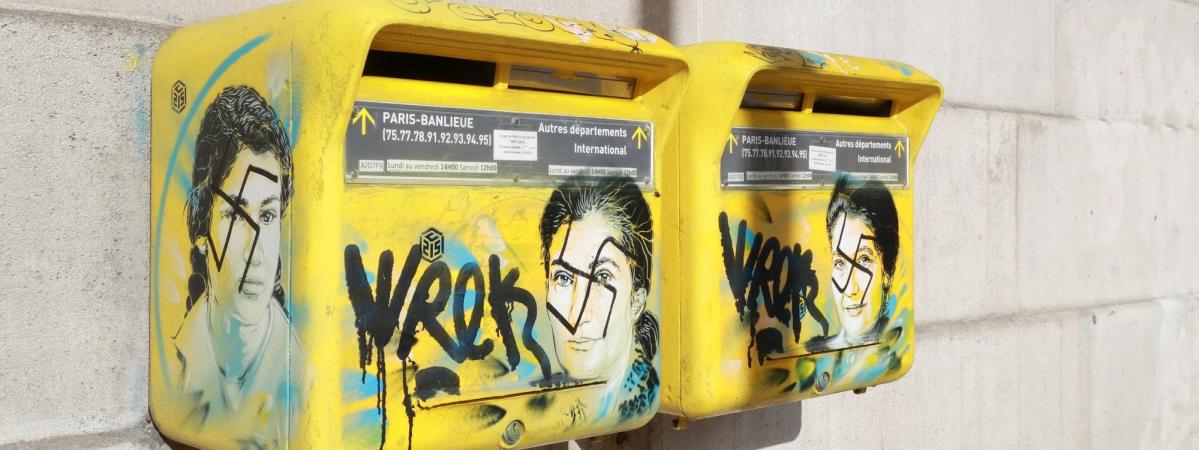 L’œuvre de Jo Di Bona est un écho d’une polémique qui a débuté en février 2019. Rappelons les faits. C 215, pochoiriste reconnu, pour célébrer l’entrée au Panthéon de Simone Weil a peint deux portraits de la grande dame sur une boite aux lettres du XIIIe arrondissement de Paris. Un arrondissement dans lequel l’artiste a ses habitudes. Dans la nuit du 11 février, les deux portraits ont été tagués de croix gammées. L’émotion dans l’opinion publique a été à la hauteur de l’outrage. Alors que la panthéonisation de Simone Veil était pour tous légitime et comprise comme le juste hommage de la patrie à une dame dont les mérites n’étaient contestés par personne, deux croix gammées ramenaient Mme Veil à son passé douloureux de rescapée de la Shoa. Christian Guémy, alias C 215, qualifia l’acte de vandalisme, d’« abject » et de « lâche ». Une cérémonie fut organisée le mardi après-midi suivant sur le parvis de la mairie d’arrondissement. Devant Pierre-François Veil, l’un des fils de Simone Veil, des membres de la famille, Jérôme Coumet, le maire divers gauche du XIIIe, le représentant du Conseil représentatif des Institutions juives de France, Mme Hidalgo déclara : « « Nous sommes ici pour réparer cet acte odieux. Dire que nous condamnons. Qu’on ne laissera pas banaliser cet antisémitisme ».