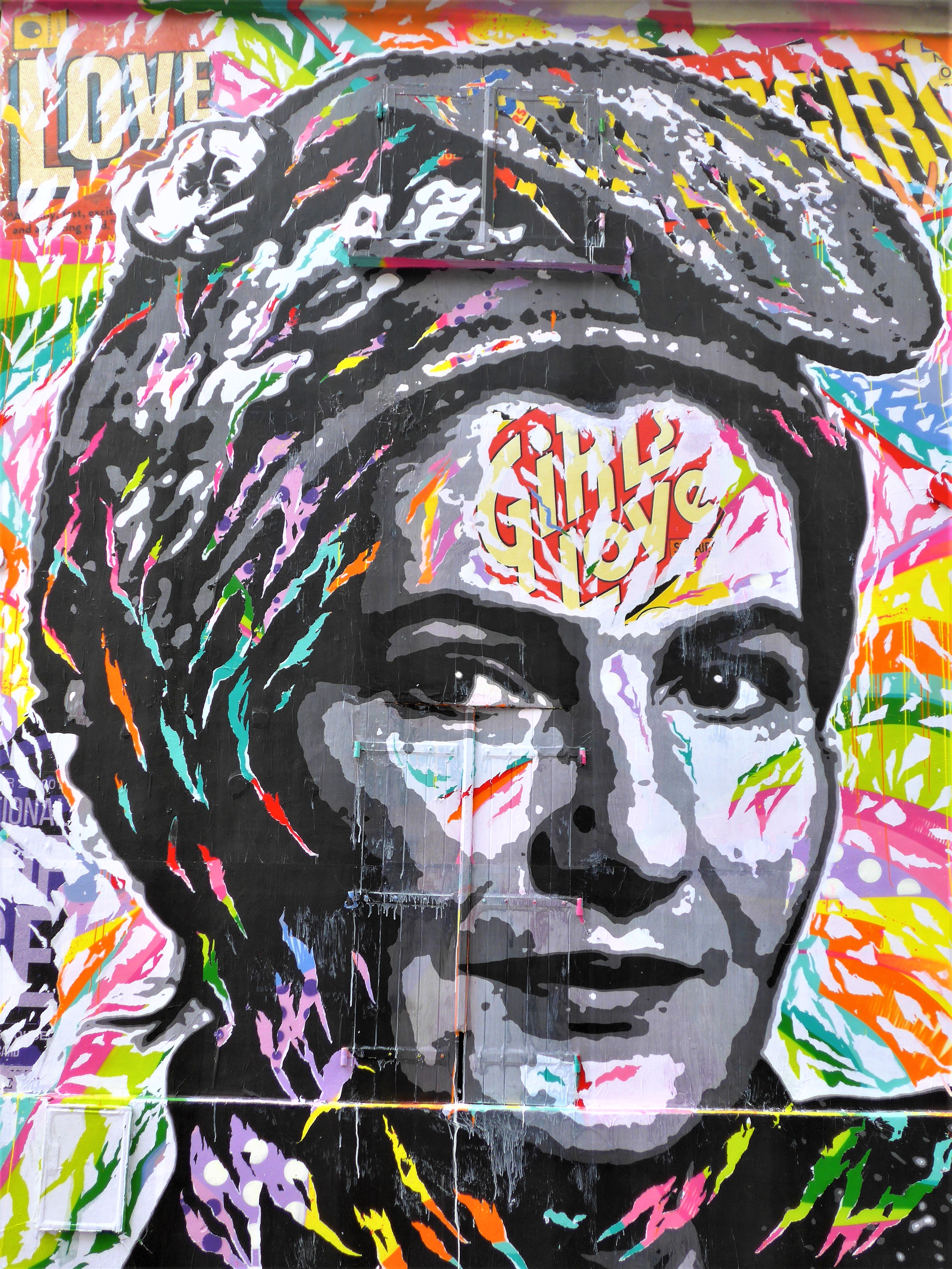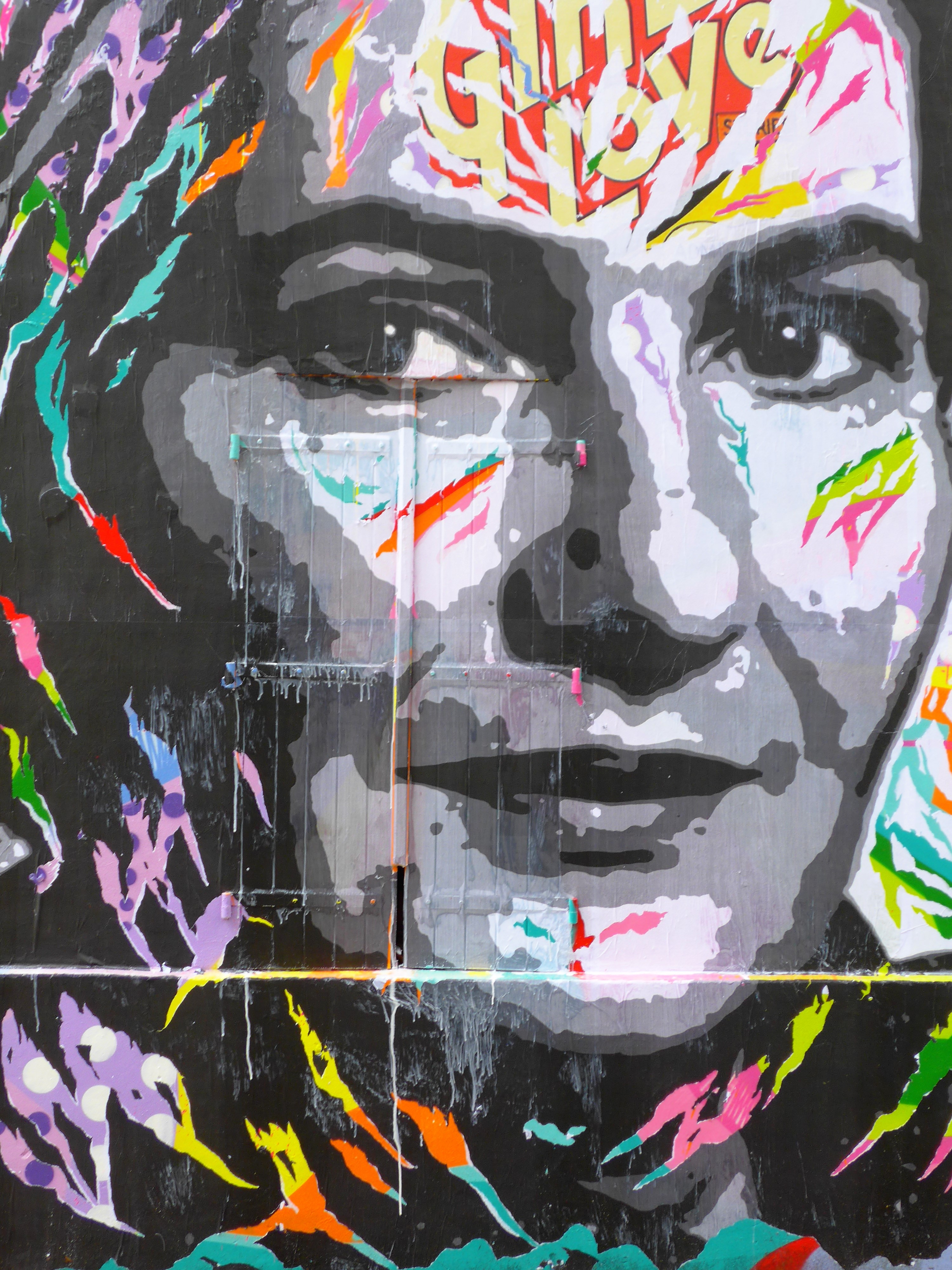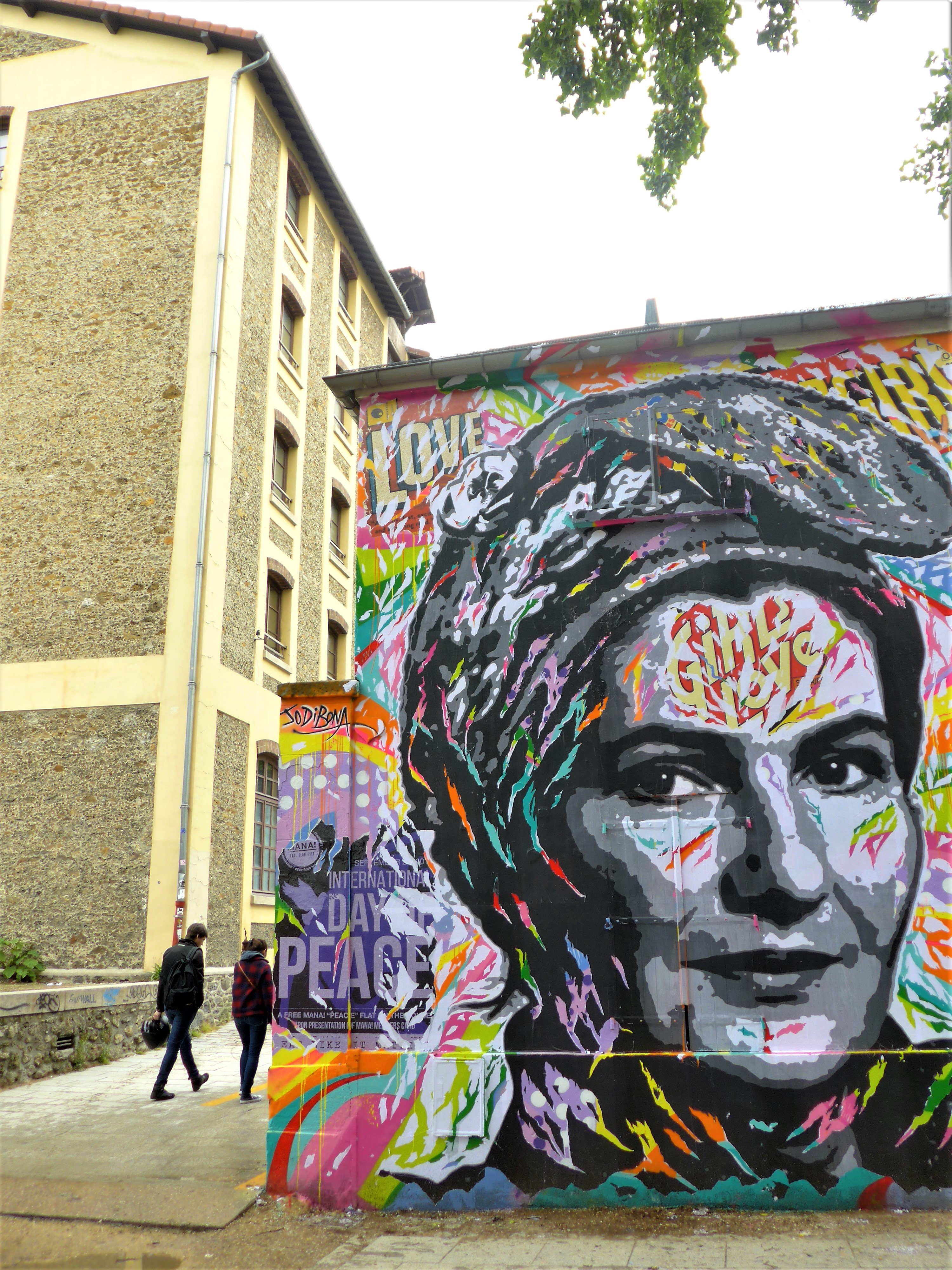 Jo Di Bona disposait, cette année, d’un beau mur. Il s’agit du mur formant pignon d’un bâtiment faisant face à un des deux magasins généraux du quai de Marne. Sa surface est importante, environ 10 m sur 6. Jo Di Bona a représenté un portrait de Simone Veil en Marianne. Le choix du sujet signe un acte fort de la part de l’artiste ; un choix qu’il convient de resituer dans un contexte pour en saisir la signification.