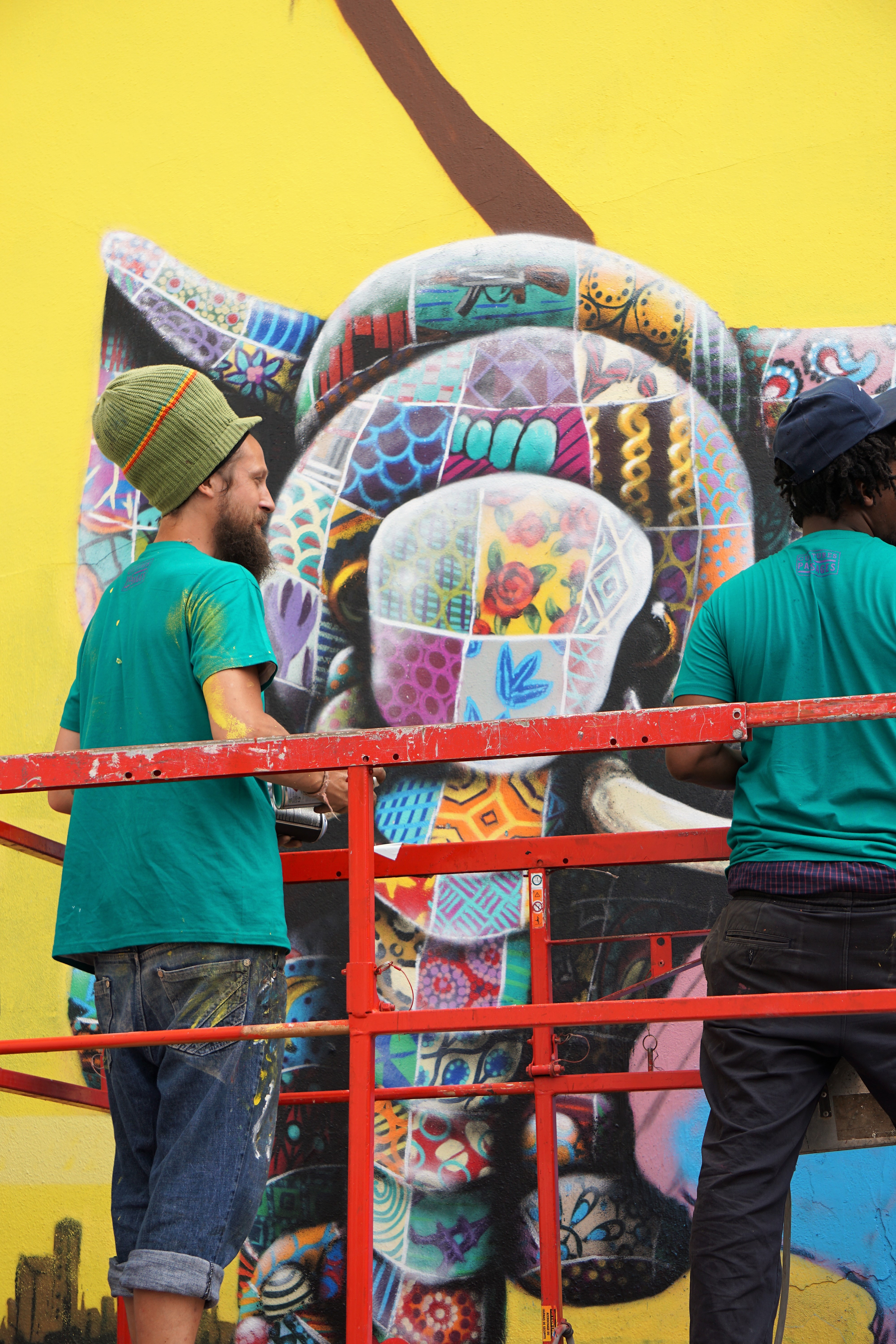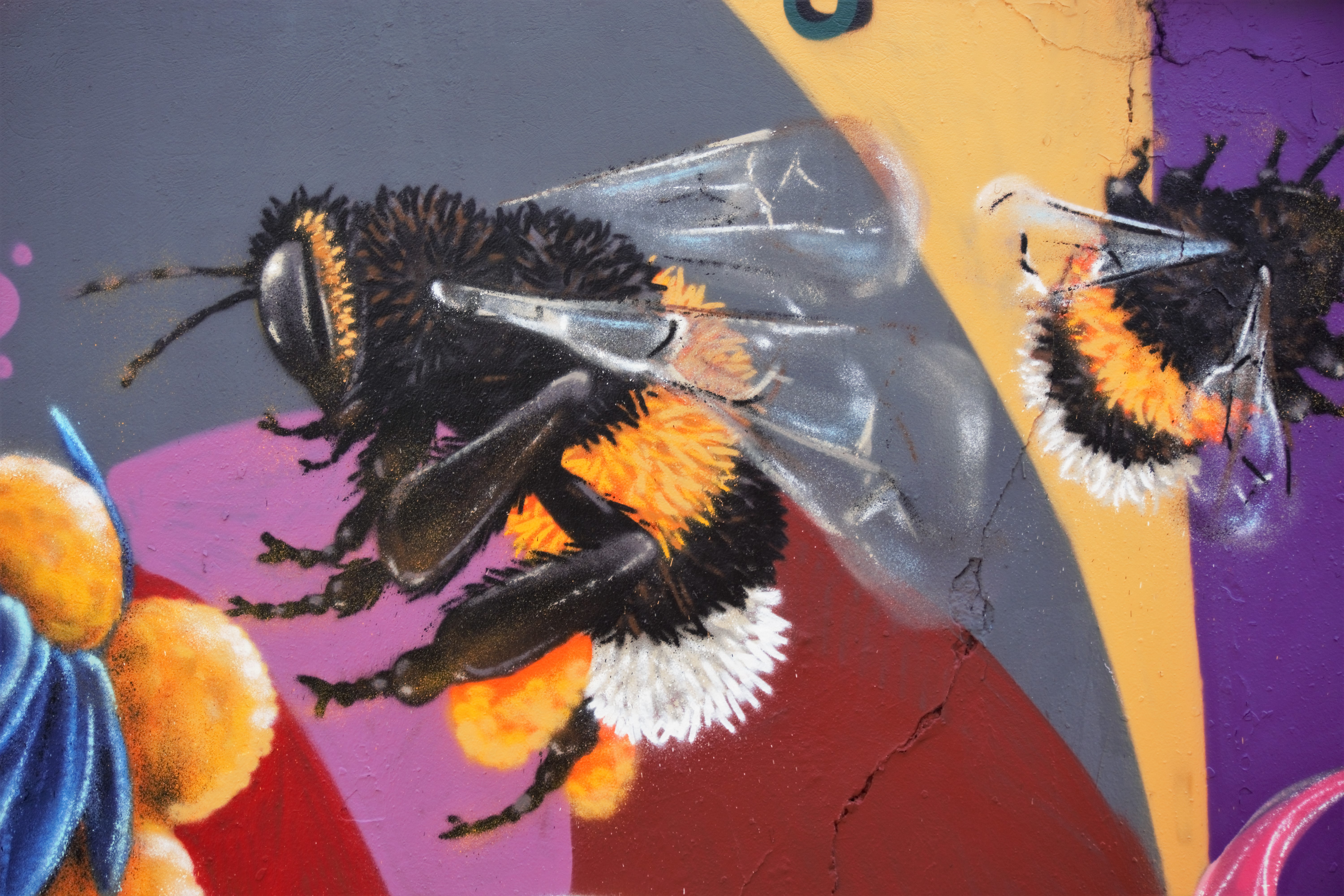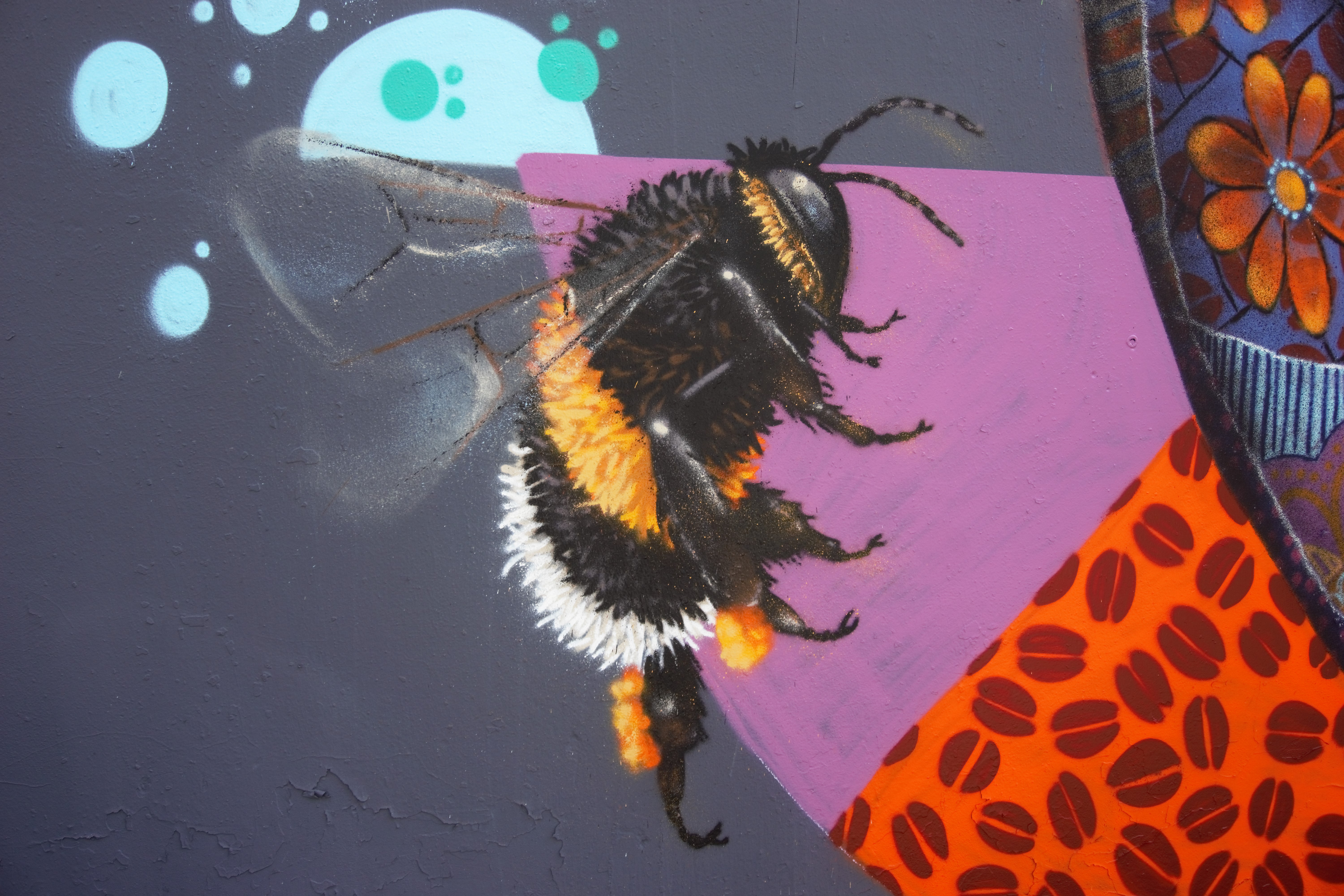 Juin 2019, même festival de street art, le même artiste peint une scène remarquable. Elle représente un lézard suspendu par les pattes arrière à une tige de fleur, se détachant sur un décor constitué de zones traitées en aplat, géométrisées et d’abeilles encadrant le sujet principal.