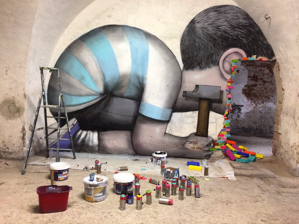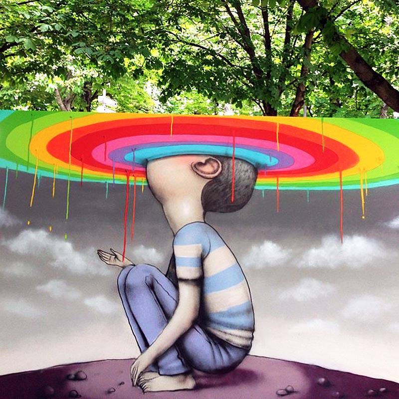 Seth nous donne quelques pistes pour savoir ce qu’ils voient. D’abord, le ciel et les couleurs mais aussi d’autres « choses ». Dans une fresque atypique l’artiste peint un jeune garçon saisit par les tentacules d’une créature bizarre qui a saisi un bras et le tire vers l’autre monde. C’est dire que de « l’autre côté » (du mur, de la lumière etc.), il n’y a pas qu’un chapelier fou ou un lapin blanc. Il a un peut-être des êtres « innommables », dont la forme ne peut être reproduite. A moins que de l’autre côté soit le lieu des interrogations de l’enfance, l’éveil de la sensualité, la relation à l’autre sexe, les mystères d’un corps qui change, de membres qui poussent, de nouvelles tentations.