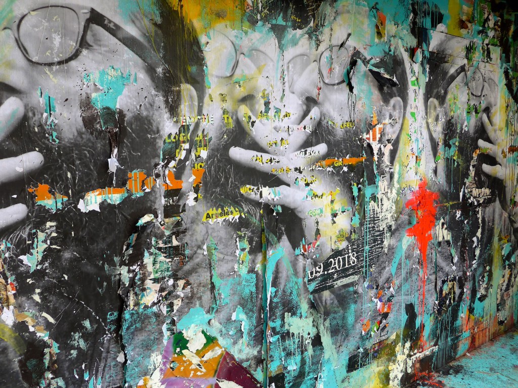 Il simule de cette manière des murs qui témoignent par l’accumulation des imprimés des périodes du passé. Il recouvre en partie le portrait des affiches lacérées. Ces morceaux déchirés forment des bandes de papier aux longueurs différentes et aux formes aléatoires. Toutes différentes par la surface, le volume, les typographies imprimées, les couleurs. Certaines lacérations sont relativement régulières, d’autres s’enroulent sur elles-mêmes comme des serpentins. Leurs couleurs innombrables, leur aspect, « encadrent » le portrait. Pour que l’illusion soit parfaite, l’artiste à la bombe acrylique, au feutre, ajoute des taches de couleurs, des coulures, des projections.