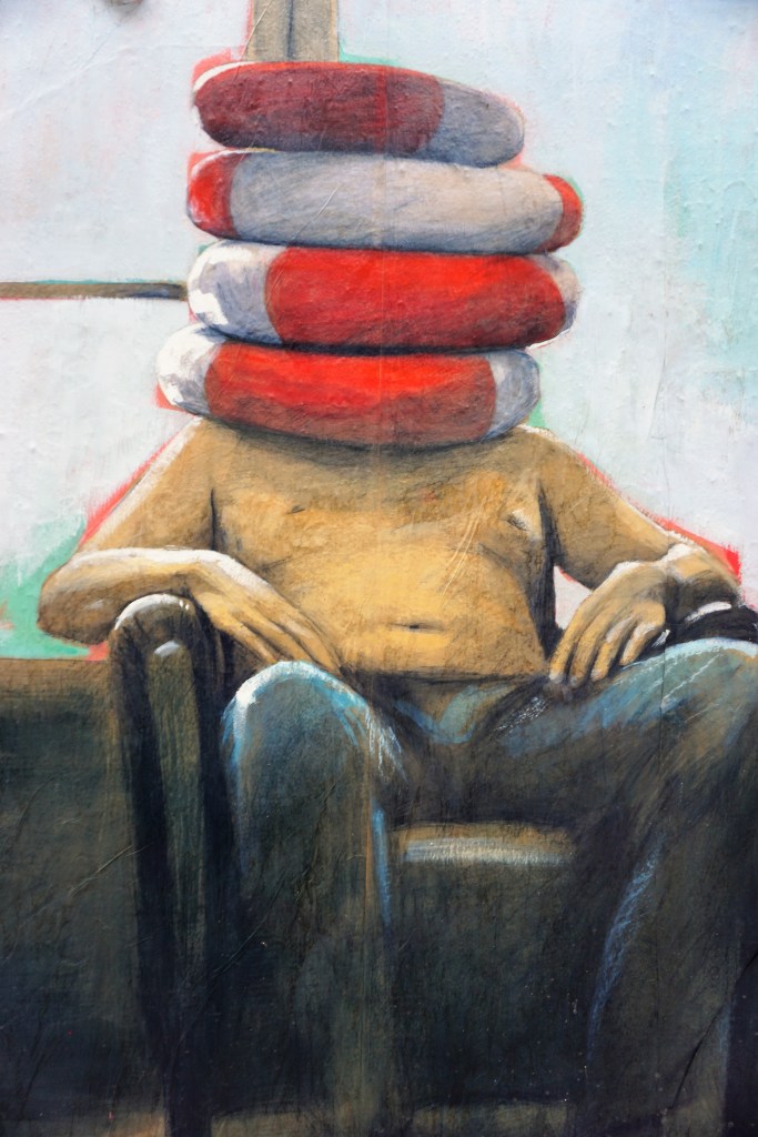 L’anonymat est un masque attestant d’une rupture et d’une seconde naissance. Les Gugusses-sans-visage, sous le pinceau de Philippe Hérard, vont vivre des aventures. Entendons-nous bien, pas des péripéties à la Indiana Jones ! Des situations périlleuses, perchés sur une vache ou sur un toit. Inconscients du danger, infoutus de comprendre la situation, donc le danger. Si le contexte n’est guère dangereux (et parfois, il l’est) les Gugusses créent la situation dangereuse avec des chaises, des échelles, des masques en forme de maisons, des poteaux de signalisation, des bouées, des cônes de signalisation. Somme toute, quand la situation ne les met pas en danger, ils s’y mettent tout seuls, avec des objets du quotidien. Ils se mettent en danger…et y restent ! Ou pire, c’est l’objet qui aurait pu les « sauver » qui les met encore davantage en danger ! (Comme la très fameuse et néfaste bouée). Le Monde ne leur fait pas de misère, ni les Autres, ni les Choses. Ils ont « le don » de se mettre (et de rester !) dans des situations impossibles.
