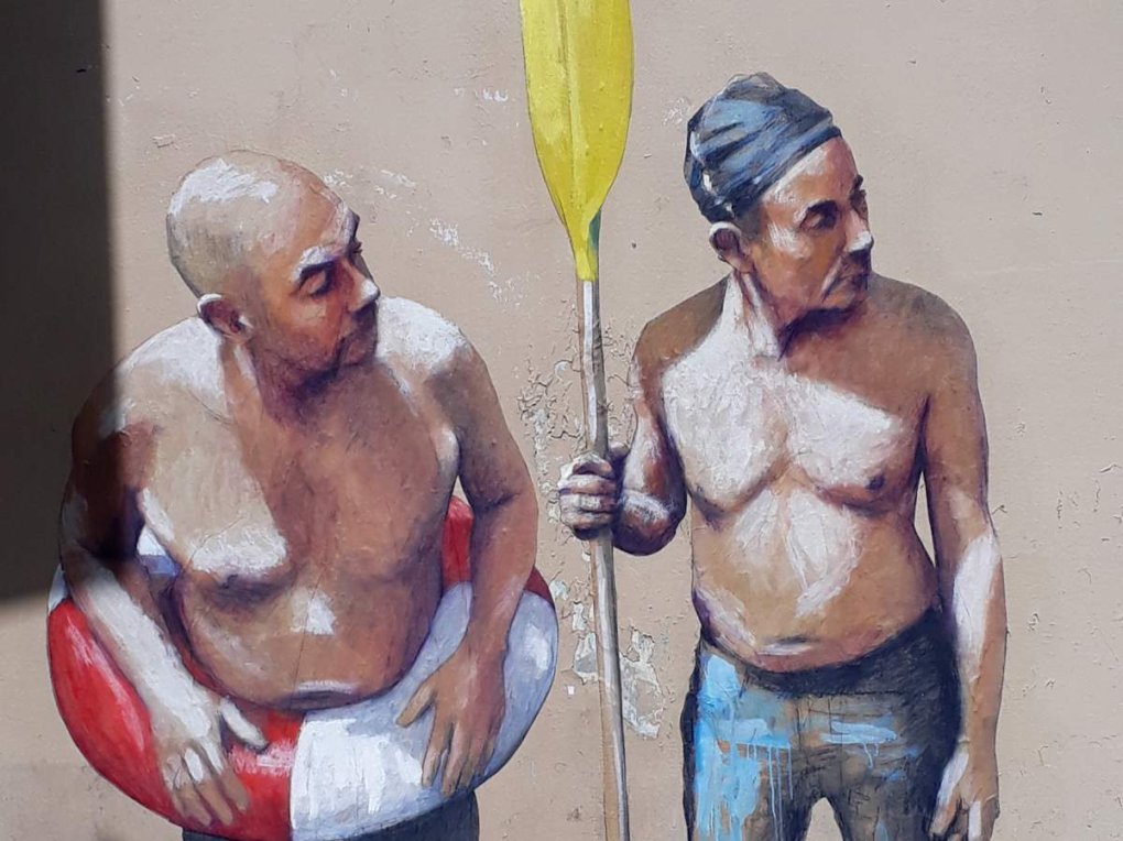 Ces Gugusses sans visage pouvaient être tout le monde et n’importe qui (y compris d’authentiques malades mentaux). Philippe Hérard a créé récemment une génération toute neuve de Gugusses. Sous les traits d’un gugusse, on reconnait maintenant l’artiste, souvent entouré de comparses. Amis, copains, qui lui servent de complices et accessoirement de modèles. Les situations vécues par la représentation de l’artiste et sa clique sont analogues aux précédentes. La bouée qui apparaissait dans de nombreux « tableaux » a amené dans son sillage (marin), la pagaie. Bouée, pagaie, slips de bain et situations cocasses autour de ces « petits baigneurs ». Ce sont des farceurs qui surprennent les passants au coin d’une rue au d’un pont. C’est drôle et tout le monde rit, le passant piégé et ceux qui se moquent. La blague est légère ; personne n’est en danger. Surtout pas les Nouveaux Gugusses. Plus attendrissants maintenant que désespérés.