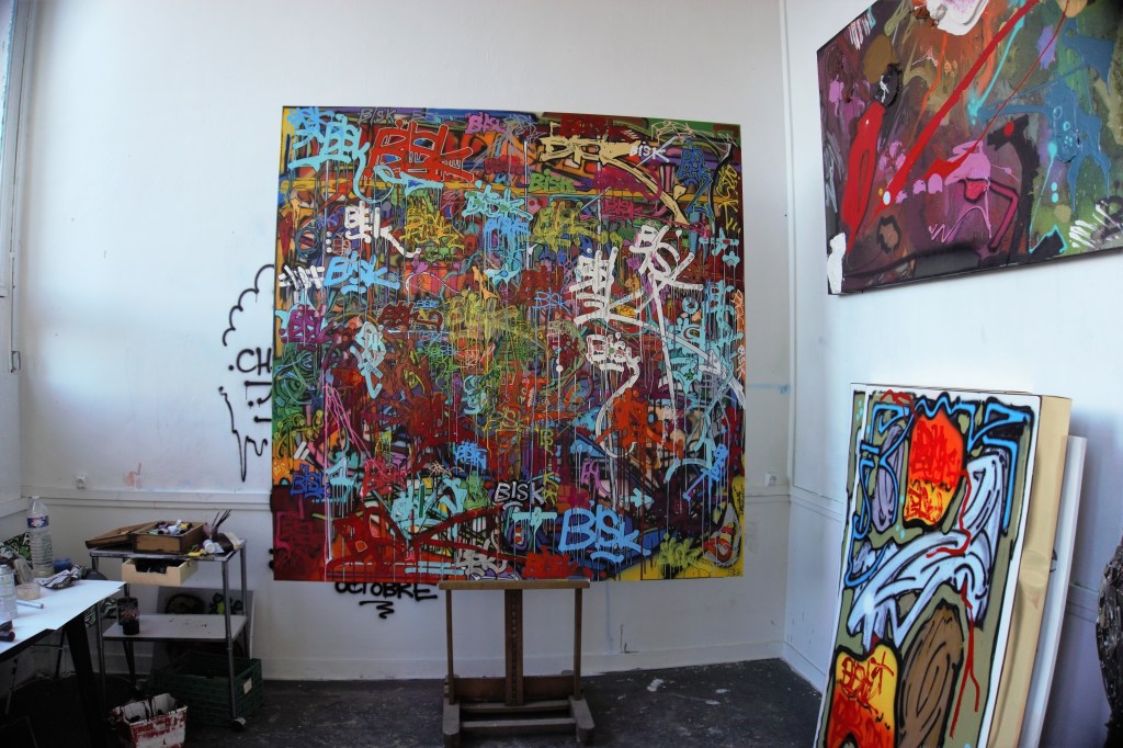 Ce que Bisk nous donne à voir est déjà un résultat. Résultat de plusieurs décennies de peinture dans la rue, une pratique dominée par le tag et le graff. J’ai été passionné par les variantes de son blaze qu’il a, devant moi, en quelques minutes, dessinées. J’ai alors compris que l’écriture de son blaze, son lettrage, n’était pas un logo définitif le représentant, mais bien davantage un processus en constante évolution graphique. Le choix de son blaze a certainement à voir avec le fameux « Bisque, bisque, bisque rage ! », certainement mais pas assurément. Les quatre lettres et la forme des lettres enchaînées ont contribué à ce choix. Mais si le blaze est défini comme le substitut du nom, le graphisme des lettres ne l’est pas. Au lieu de réitérer toujours le même lettrage de son blaze, Bisk s’ingénie à en varier à l’envi les formes.