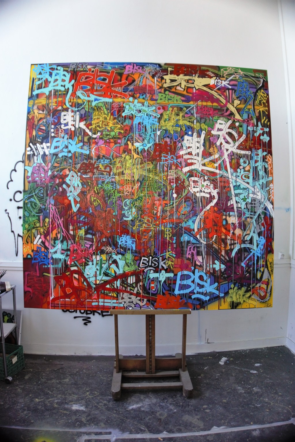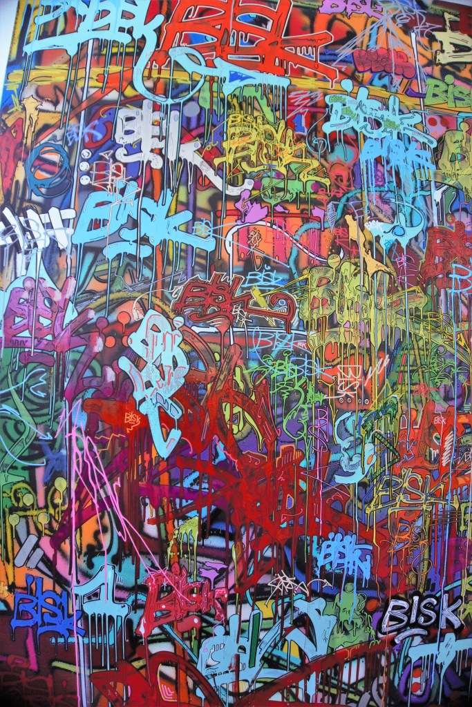 Certes Bisk connaît les toiles de Jonone, mais il affirme que ça n’a eu aucune incidence sur son travail. Je le crois volontiers. La réitération « à l’infini » de son blaze croise une histoire personnelle, une relation d’une grande profondeur, avec l’image qu’il a de lui-même. D’aucuns seraient tentés d’analyser les méandres de sa pensée et de sonder ses reins et son cœur. Je m’en garderais bien. Je fais simplement le constat que la calligraphie de son blaze joue un rôle central non seulement dans l’œuvre de Bisk mais également dans sa vie intérieure.