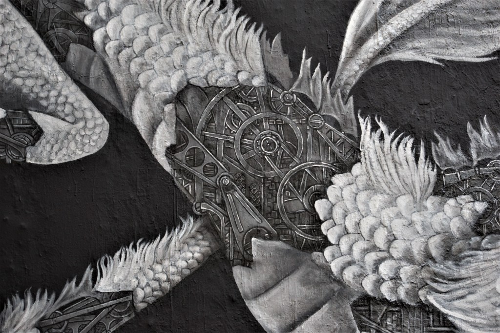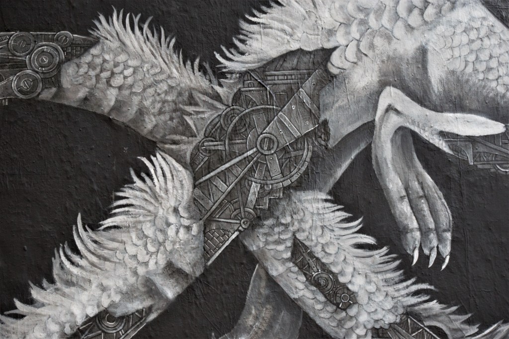 Dans sa fresque du Dragon, Ardif n’a ajouté qu’une seule touche de couleur, le bleu de l’œil. Si on regarde d’un peu près l’ensemble de sa production, les collages et les fresques, le moins qu’on puisse dire, c’est que le peintre utilise la couleur avec une relative parcimonie, du moins pour la partie mécanique des animaux. Ce trait renforce la parenté avec le dessin technique. Par ailleurs, l’utilisation de gris, de noirs de différentes densités et de blancs plus ou moins purs renforce le contraste avec la partie « physique » de l’animal. Ardif insiste sur ce point avec justesse : « Le noir et blanc est une base que j’apprécie beaucoup, même si de temps en temps je le rehausse de couleurs car il y a des animaux dont la teinte évoque directement quelque chose, qu’il s’agisse du rose du flamant ou de la couleur rousse du renard. Cela marque un contraste encore plus marqué avec la machine et apporte une nouveauté. »