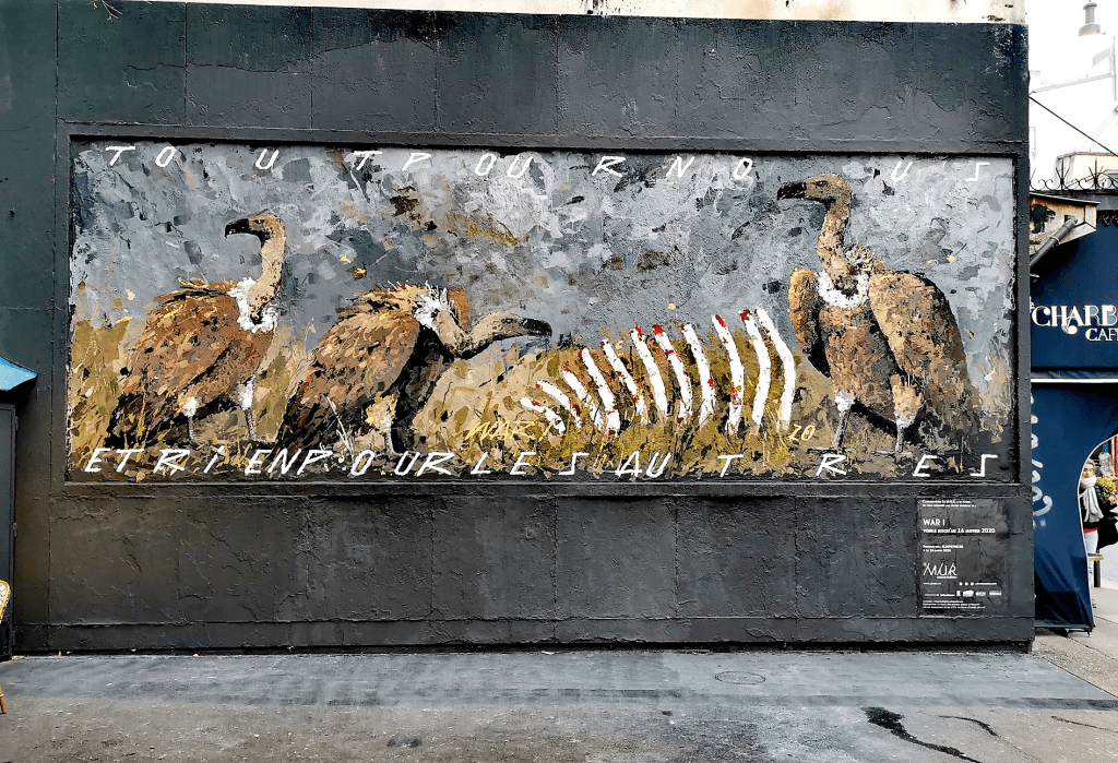 Le 4 et 5 janvier 2020, War a peint sur le mur Oberkampf une fresque politique d’une grande violence visuelle. La fresque est une illustration d’une citation tronquée d’Adam Smith : « Tout pour nous et rien pour les autres » voilà la vile maxime qui paraît avoir été dans tous les âges, celle des maîtres de l’espèce humaine. »