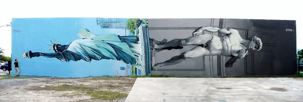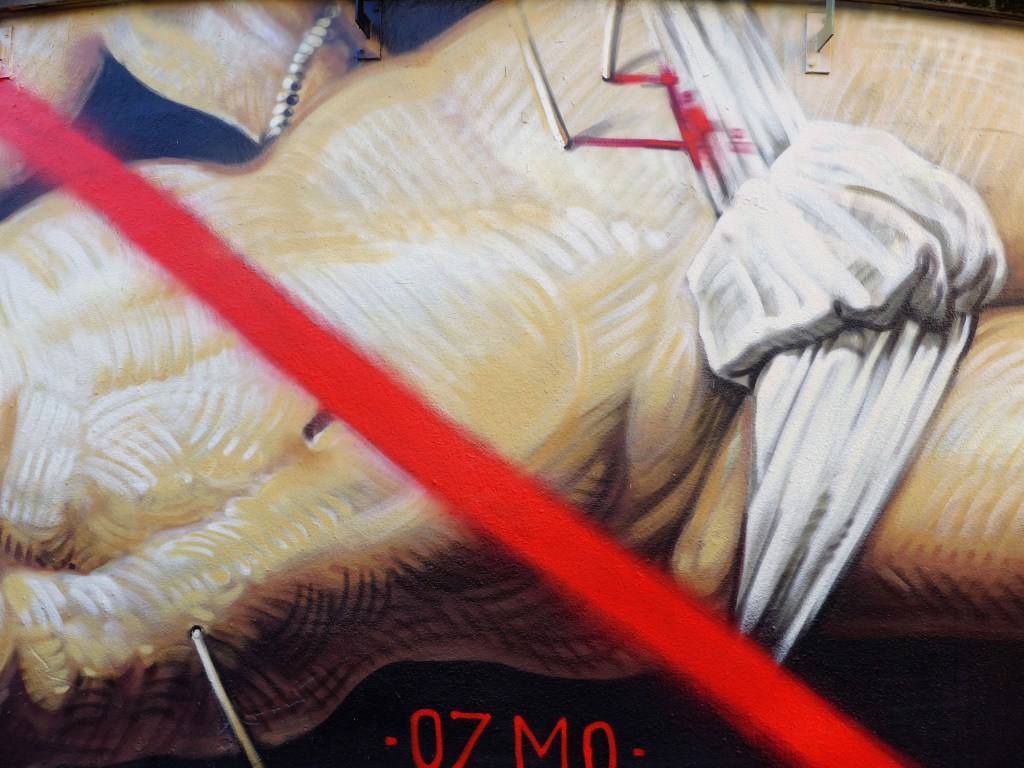 Si la fresque d’Ozmo est originale dans la production française, elle ne l’est pas dans la production de l’artiste. Les sujets religieux, plus précisément, chrétiens, encore plus précisément, les représentations des œuvres les plus universellement connues sont pour l’artiste un terrain de jeu. Un jeu sur les formes, un jeu également sur la réinterprétation des lectures.