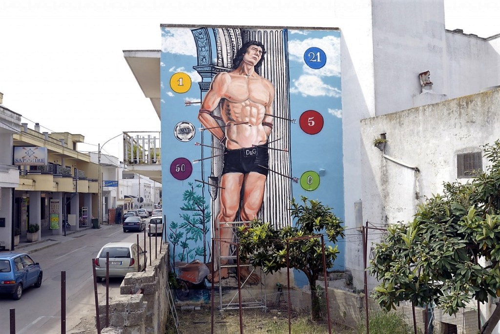 Notons au passage que l’hommage d’Ozmo n’est pas une reproduction à l’identique de son modèle. De nombreuses différences existent qui ne sont pas des détails. D’abord (ceci est une évidence) saint Sébastien a été couché pour prendre en compte la forme du mur bien sûr mais aussi et plus sérieusement parce qu’Ozmo est coutumier du procédé. Mettre à l’horizontale une image iconique c’est la faire descendre de son piédestal et, en quelque sorte, renverser la statue du Commandeur, désacraliser les images sacrées. De plus, il modifie la position des bras et des mains, réduit le périzonium, pixellise le visage, inverse la cambrure du corps. Par contre, l’artiste s’est efforcé de reproduire ce que je désignerais comme « l’identité visuelle » de Rubens, dans le jeu des ombres et des lumières et une forme « classique ».