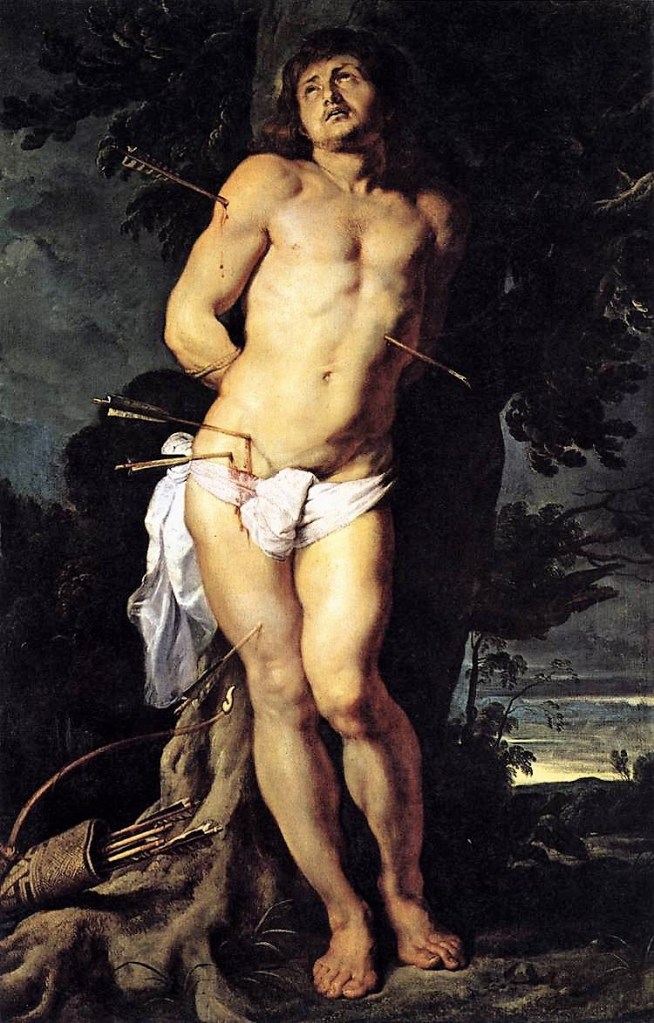 Saint Sébastien est un martyr chrétien qui survécut à la sagittation[1]. Comme un grand nombre de saints, saint Sébastien était adoré comme protecteur de la peste. La corrélation entre flèche et peste peut nous sembler étonnante aujourd’hui. Les flèches du supplice étaient associées à la propagation des maladies contagieuses car on pensait que les miasmes se propageaient dans l’air, comme les flèches. De la peste qui ravagea le moyen-âge, par extension, Saint Sébastien fut réputé protéger des maladies. Toujours par extension, aujourd’hui, le culte du saint perdure auprès des catholiques homosexuels qui le revendiquent comme saint patron et intercesseur au grand dam de l’Église apostolique et romaine. Il est vrai que depuis la Renaissance et surtout le début du XIXème siècle, Saint Sébastien est un symbole homoérotique et une icône homosexuelle.