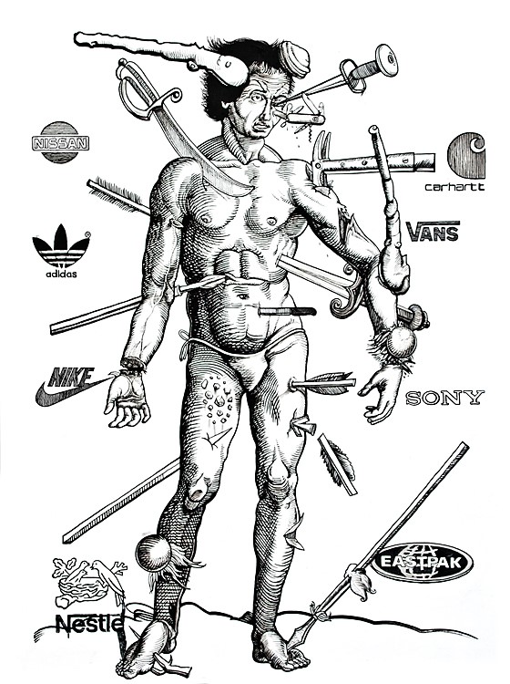 Venons-en à ce grand trait rouge qui enveloppe le corps de saint Sébastien sans le traverser. J’y vois une référence claire au ruban rouge qui symbolise la lutte contre le sida. Quant aux petits personnages de cartoons, ils paraissent fuir la terrible maladie. Un clin d’œil de l’artiste à ses premières productions, une façon à la fois de s’approprier le tableau de Rubens et de dédramatiser la scène du martyre.