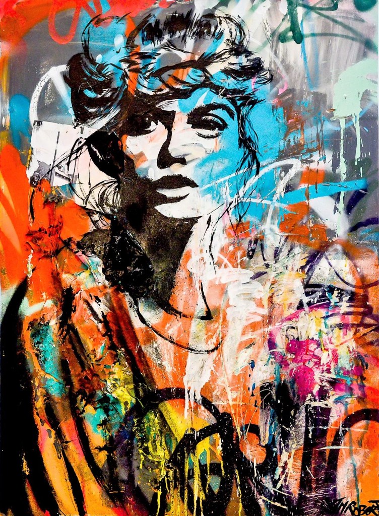 Les street artistes et bien d’autres ont repris à leur compte ces caractéristiques formelles : les traits du visage sont peints en noir, les carnations sont traitées comme les autres éléments de l’œuvre, le fond en particulier. Les portraits dont j’ai déjà dit dans ces colonnes l’abondance dans l’ensemble de la production (les traditionnelles marines, paysages, nus académiques ont quasiment disparu de l’art urbain) changent radicalement de fonction et donc de statut. Depuis des temps immémoriaux, on se faisait « tirer » le portrait. Le portrait était, en conséquence, le portrait d’une personne dûment identifiée (le plus souvent, sur la partie inférieure du cadre était gravés le nom de la personne dont le visage était peint et le nom de l’artiste). C’est encore le cas de nos jours, pensons aux hommages que les street artistes rendent à leurs amis décédés. Le plus souvent, les portraits sont des portraits de personne ! Les traits du visage sont esquissés et l’espace jadis dédié aux carnations est devenu un espace d’expression. Les œuvres oscillent ainsi entre réalisme et abstraction.
