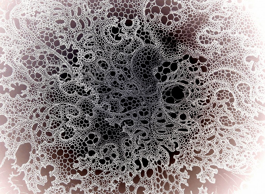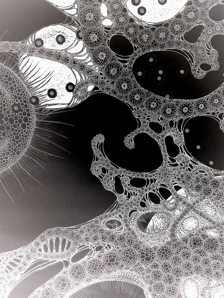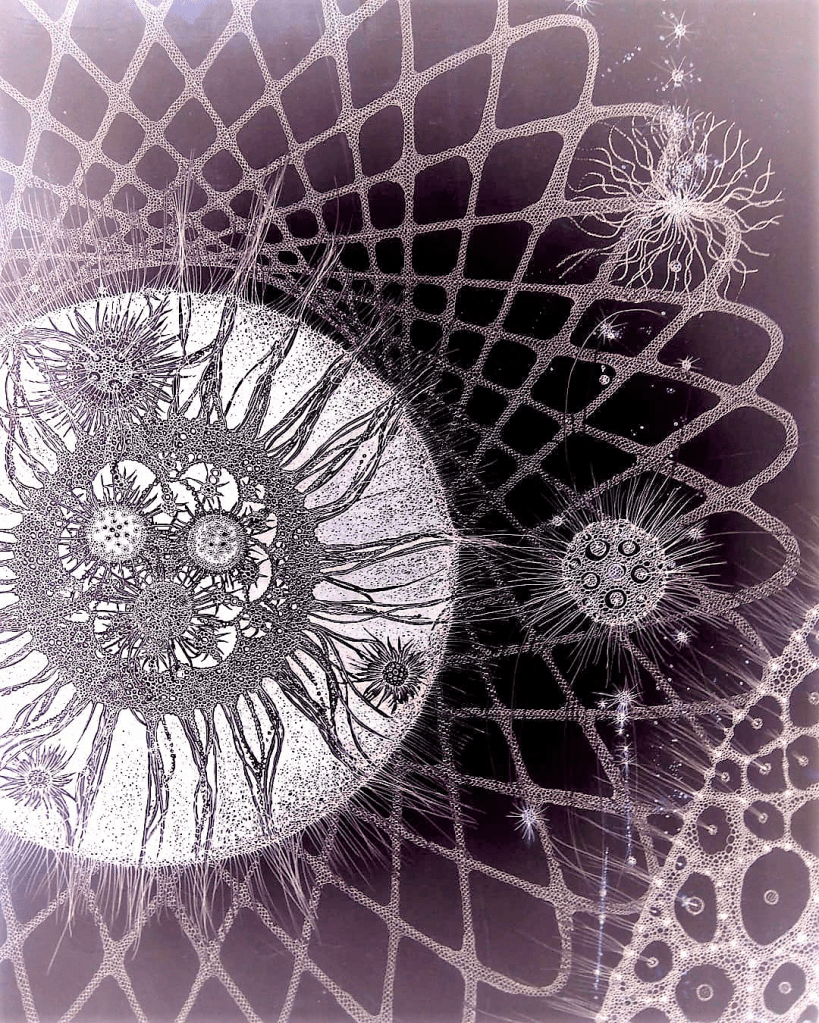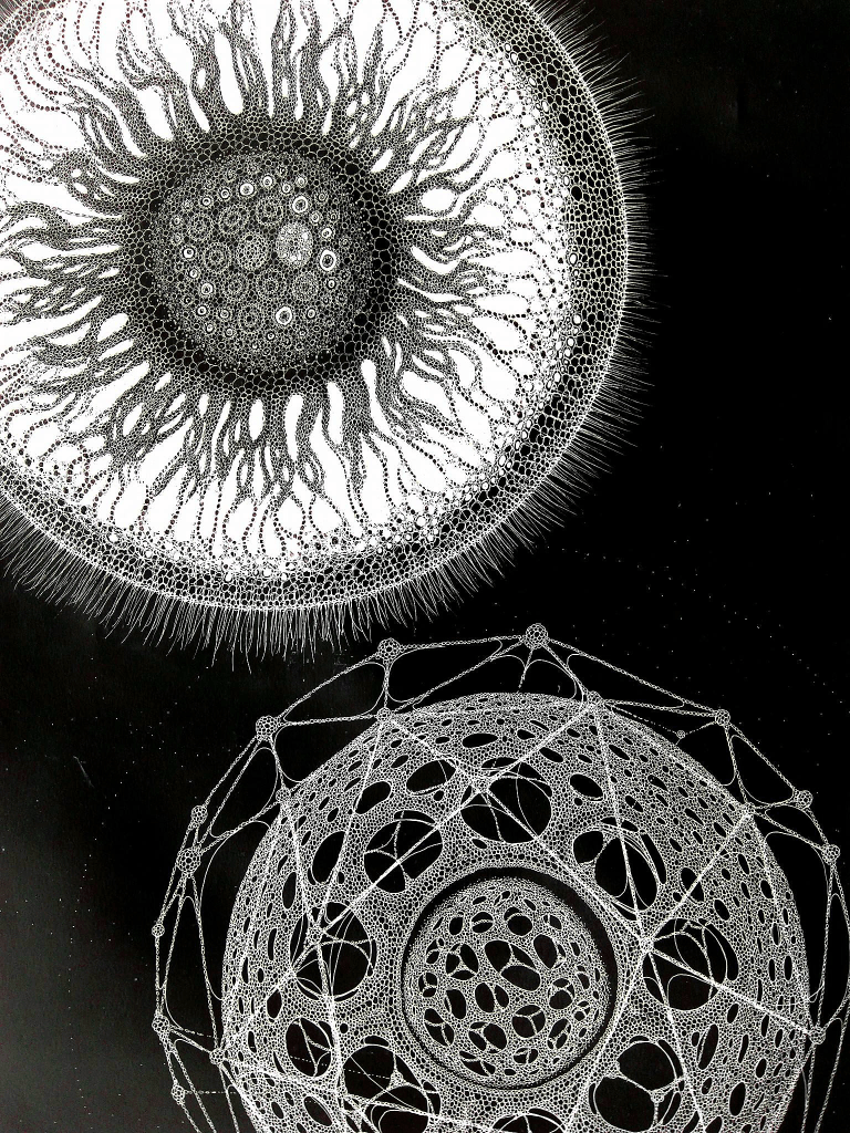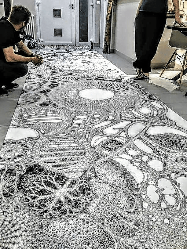 L’artiste n’a qu’un outil, un simple feutre, pour dessiner ses « ronds » et ses filaments qui relient entre elles, dans un réseau d’une incroyable complexité, des formes. Il suffit de changer d’échelle et le regardeur ne voit plus de cercles parfaits ni de courbes régulières, encore moins de traits droits. La main de l’Homme étant imparfaite, son dessin l’est également.