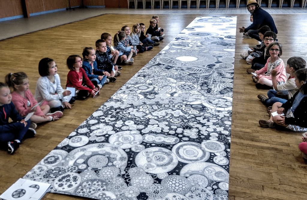 En écrivant cette conclusion, j’ai à l’esprit l’image de son rouleau de 10 mètres de long sur 1,50 de large étalé sur le sol, encadré par les têtes curieuses des enfants qui s’émerveillent des « beaux dessins » et d’Epi2mik, à leur côté, bienveillant, répondant aux questions des mômes. Je me dis que ce rouleau est peut-être symbolique du rapport d’Epi2mik aux autres. Comme un cordon ombilical, le rouleau, le dessin, est ce qui le relie au Monde. Le fil est ténu. Un trait médium sur du papier. Mais il lui est essentiel.