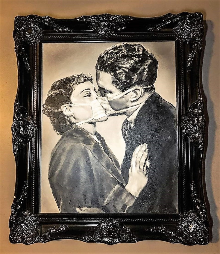 L’amour se conjugue avec l’humour. Le French Kiss adopte une variante : des masques séparent les deux amoureux. Belle image certes mais qui a dit qu’il était interdit d’embrasser l’être aimé ? Jusqu’aujourd’hui ! quant à demain c’est une autre histoire, il n’est pas nécessaire voire obligatoire de remplir une dérogation pour baiser avec passion les lèvres aimées (et plus, si affinité).
