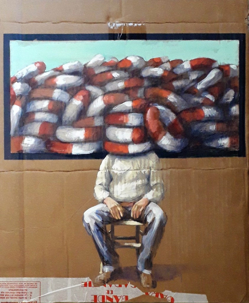 Je souhaite consacrer ce papier aux dix premières œuvres de Philippe Hérard. Hérard depuis le premier jour du confinement peint sur un bout de carton une œuvre qui correspond à son état d’esprit. La série forme ainsi un journal en images (et quelles images !) d’un confiné. Si j’effectue aujourd’hui un arrêt sur image, cela ne signifie pas que la série est terminée ; elle durera (si je ne m’abuse !) le temps du confinement. Aussi, je vous invite, chers lecteurs et lectrices, à suivre chaque jour, les tribulations imaginaires, d’un artiste peintre, confiné dans son atelier mais libre dans sa tête (comme Diego !).