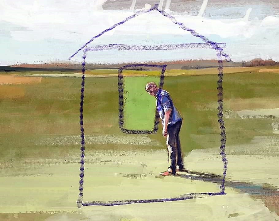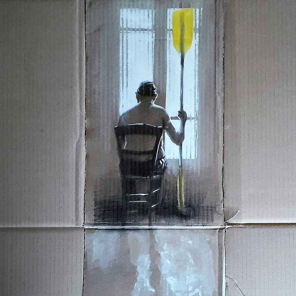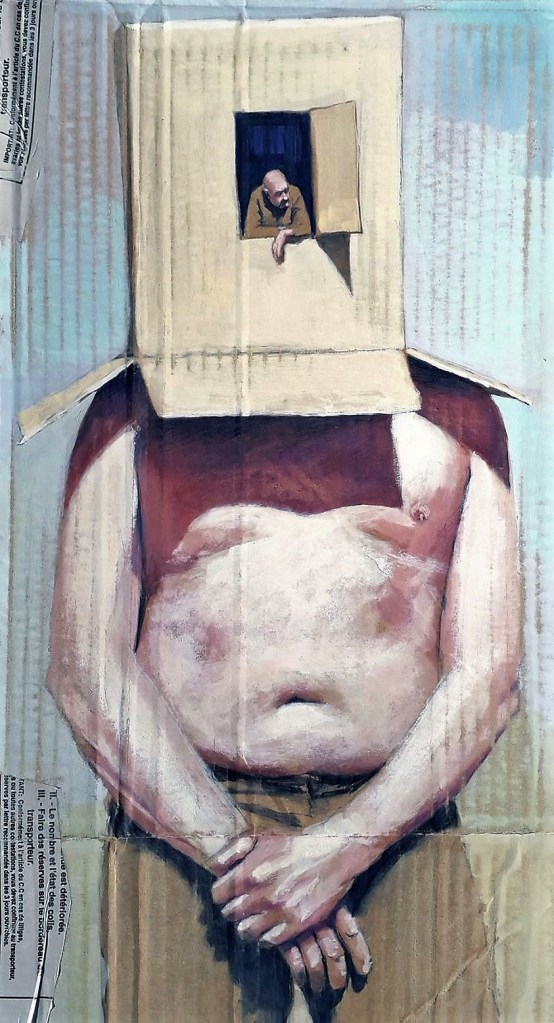 Dans son « journal d’un confiné », Hérard-Gugusse en chef, représente ses états d’âme. D’abord, la peur. Ensuite et ce sera un fil rouge, l’enfermement. Quelques tentatives de fuite dans de grands espaces lumineux, pour un aller-retour dans la boite. La boite, le carton, la maison est un lieu clos. Ou presque. A peine peut-on y ouvrir une petite fenêtre.