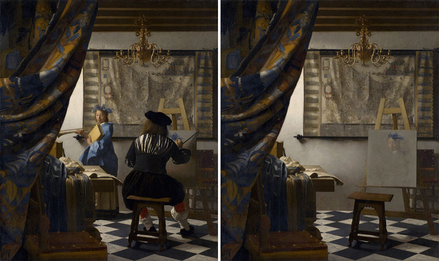 J’ai choisi 5 des tableaux de la série « Espaces cachés » de Ballester. Ils représentent des œuvres emblématiques de grands noms de la peinture classique : Vélasquez, Goya, Léonard de Vinci, Botticelli, Vermeer. L’artiste a supprimé toutes les représentations des Hommes (y compris les reflets dans les miroirs !). Reste le décor.