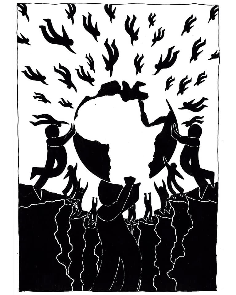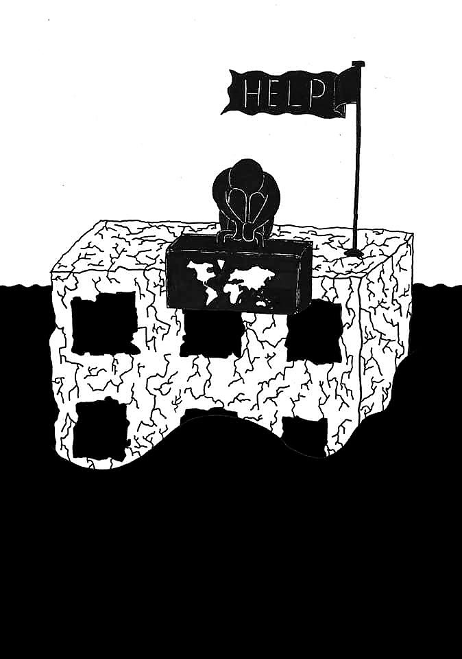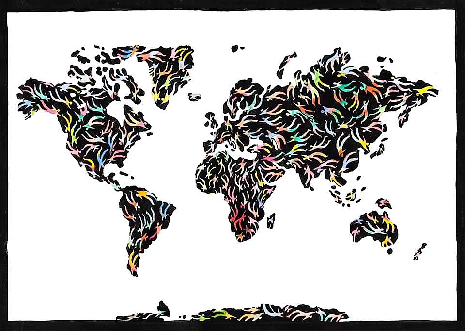 Dans le corpus des dessins étudiés, des constantes : l’emploi de marqueurs, l’utilisation quasi exclusive du noir et blanc, la fréquence du format A4 des œuvres. Quant aux « constats » de Théo des occurrences fortes : l’écologie au sens large, le réchauffement climatique mais aussi le drame de l’immigration et la solidarité. A ce propos, notons l’extrême fréquence du dessin des « mains serrées ». Ce dessin qui en premier lieu renvoie aux valeurs d’amitié, d’entraide, de solidarité, est devenu un marqueur identitaire de l’artiste, tout autant que son personnage, le rêveur.