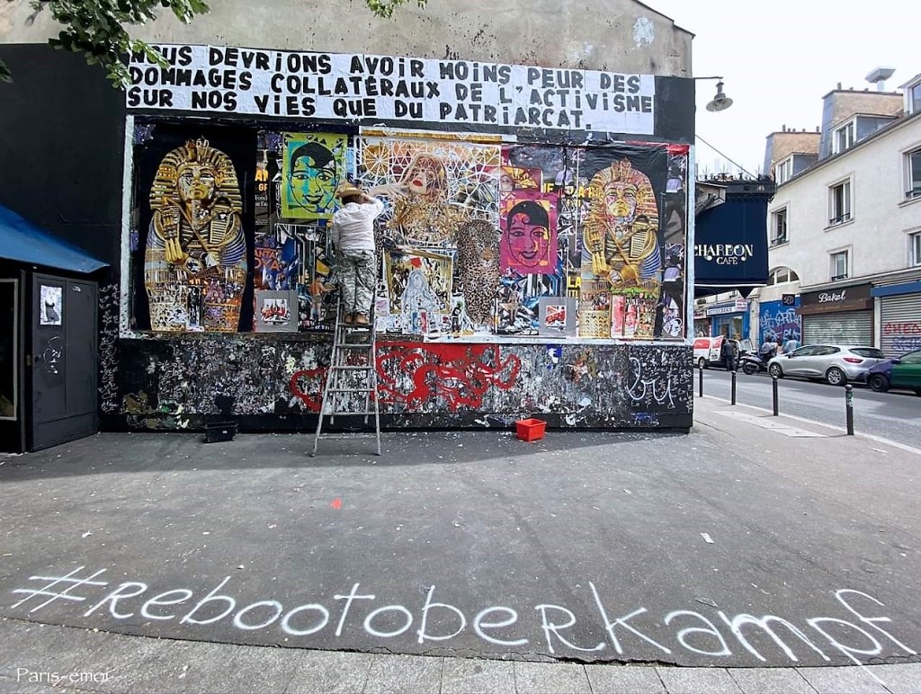 Au-dessus du collage, a été écrite (collée !) une longue phrase : « Nous devrions avoir moins peur des dommages collatéraux de l’activisme sur nos vies que du patriarcat. » Une phrase qui vient en résonance avec l’actuelle activité des revendications féministes.