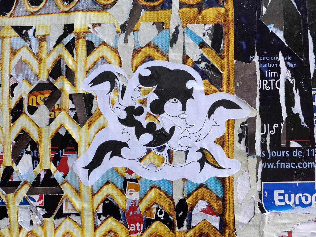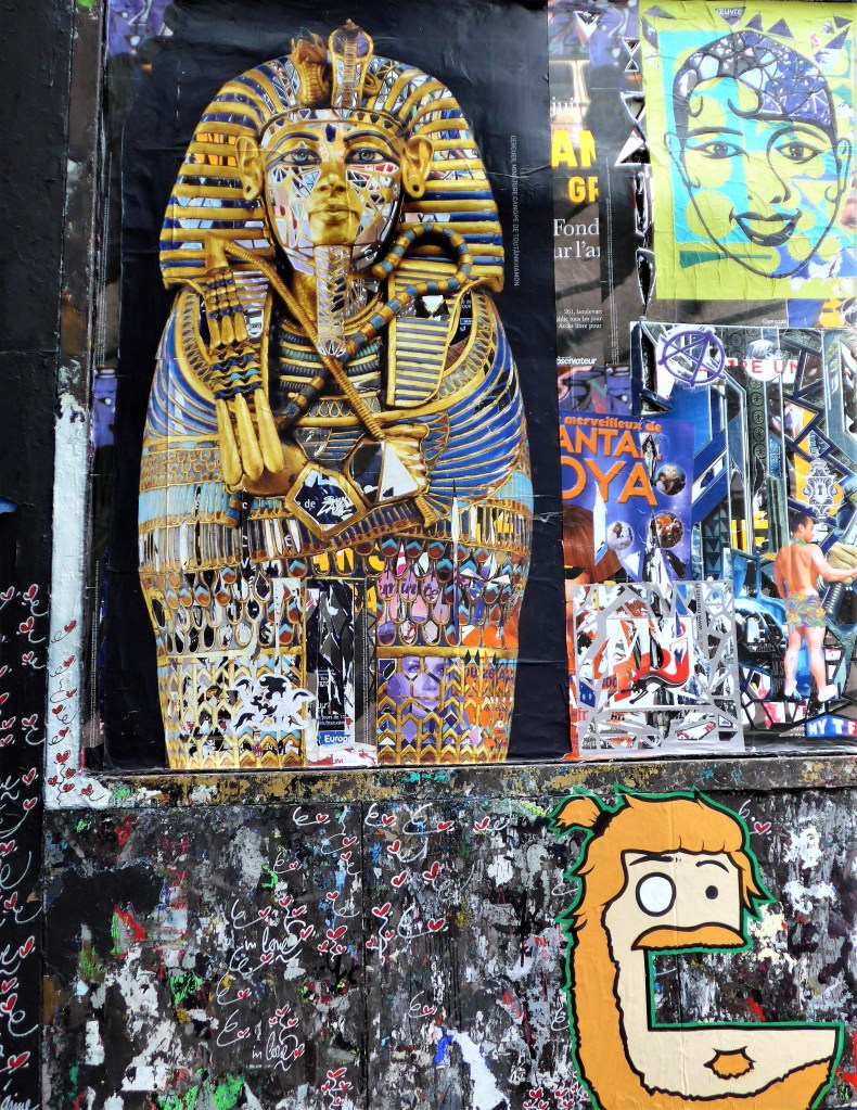 Ce qui est plus ou moins vrai ! Certains collages sont uniques et un intrus, un pochoir, s’est même glissé dans l’œuvre ! La symétrie et surtout l’encadrement par les Toutankhamon organisent l’œuvre globale lui donnant une relative cohérence spatiale. En fait, les amis de Thom Thom ont apporté des pierres à l’édifice. Parfois de petites pierres, comme celles de 13 Bis, parfois une déclinaison en diptyque, comme les deux collages de Marquise.