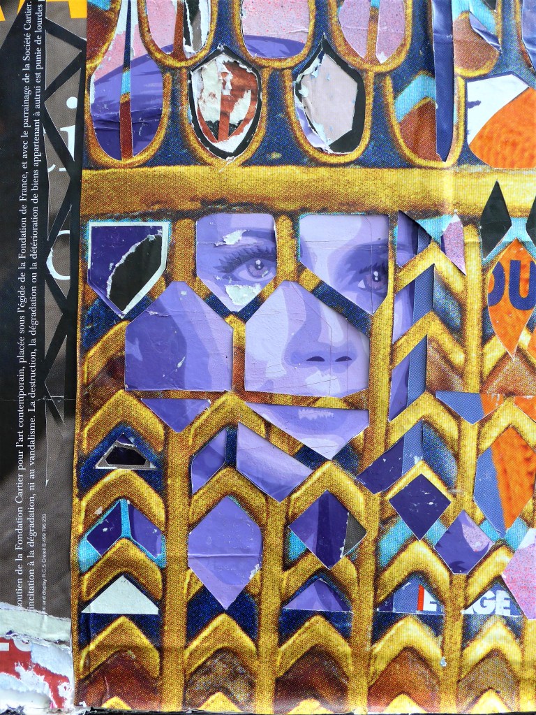 L’affiche est à la fois le matériau de son projet artistique et la finalité ultime. Un peu obscur voire sibyllin ? J’en conviens. Développons donc. Thom Thom sélectionne des affiches qui seront, « travaillées », des œuvres d’art ressemblant à des affiches. Chacun aura compris que le premier temps de la démarche est le recueil du matériau. En fonction de l’image que Thom Thom veut créer, l’artiste choisit avec grand soin des affiches. Des affiches publicitaires, des affiches de cinéma, pas d’exclusive, le choix est guidé par les images des susdites affiches et du « lettrage ». Photographies et typographies certes montrent et disent mais elles témoignent également d’une forme de culture, d’une période historique, de modes passées. Bref, les affiches sont à leur manière des « témoins de leur temps ». Le second temps est un méticuleux et long « travail » des images. Thom Thom (je l’avais montré dans un article paru voilà plusieurs années)[1] découpent un savant moucharabieh, complexe comme les fils de soie d’une toile d’araignée qui a deux fonctions, il cache et il montre. Autrement dit, des fragments d’affiches apparaissent dans les vides découpés par l’artiste. L’œuvre est formée de l’ensemble composé par les affiches « de fond » et du réseau réticulaire.