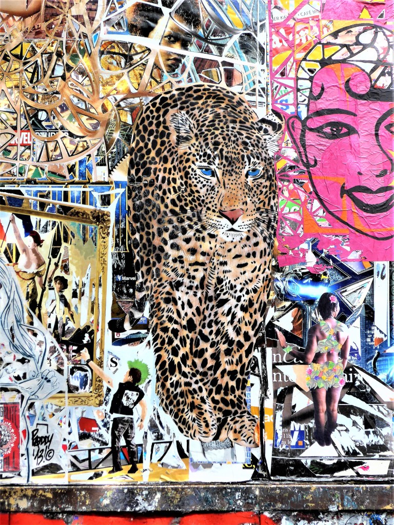 Nous remarquons qu’à l’encadrement des sarcophages correspond un collage symétrique des œuvres par rapport au motif central du portrait. Les tigres de Mosko (Mosko, grand pochoiriste devant l’éternel, a, pour l’occasion peint ses pochoirs sur des affiches découpées), les tigres inversés, font pendant au portrait de Thom Thom. Ils découpent l’espace en trois parties, leur hauteur rythmant l’ensemble de la composition (alternance grand / moyen/grand/moyen/grand). Le collage de Paddy renforme l’axe central ajoutant au regard de la très jolie femme, un autre regard de femme qui non seulement regarde le regardeur mais photographie les photographes. Une mise en abîme pour les happy few. Les deux portraits de FKDL (celui de Joséphine Baker, si je ne m’abuse !), bien que collés à des hauteurs différentes concourent à la perception globale d’une composition symétrique.