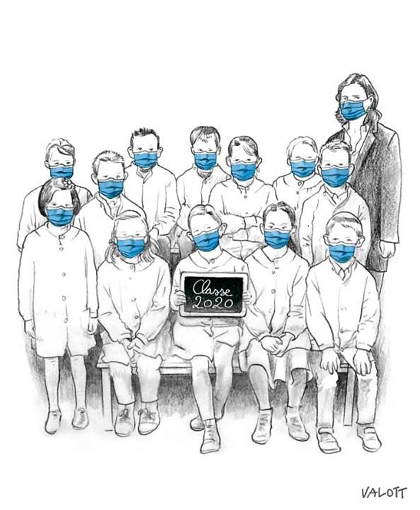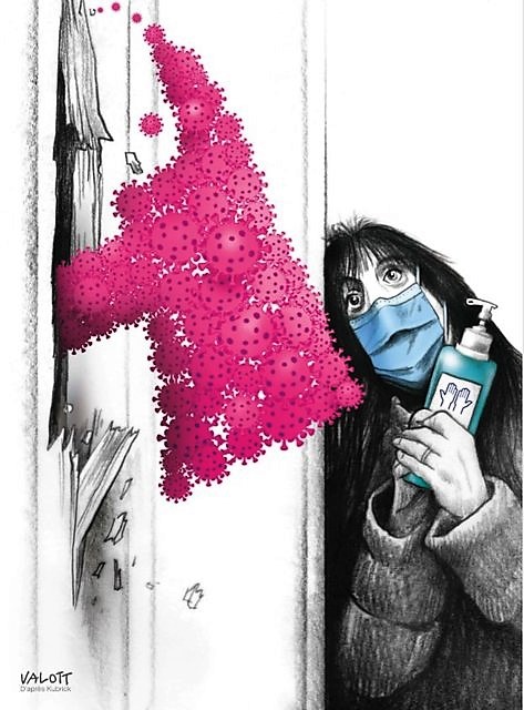 La série de dessins de Valott est une chronique douce-amère de la période que nous venons de vivre. Il se moque avec retenue de nos travers, la recherche des masques et du gel hydroalcoolique en particulier, et porte un regard amusé et tendre sur notre humaine condition.