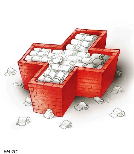 Il est curieux de remarquer le nombre de références culturelles de ses dessins. De ses deux mains qui se touchent au-dessus d’un flacon de gel hydroalcoolique, référence au fameux plafond de la chapelle Sixtine de Michel-Ange, à la hache qui fend une porte close, clin d’œil à la scène culte du film « Shining » de Stanley Kubrick, à « La grande vague de Kanawaga » d’Hokusai, à la trop célèbre petite moustache ridicule d’Hitler, aux dessins du virus « à la manière de ». Ajoutons pour faire bon poids, un Picsou masqué qui thésaurise les masques et le drapeau national symbole de la nation.