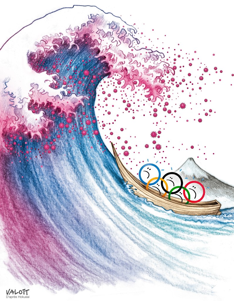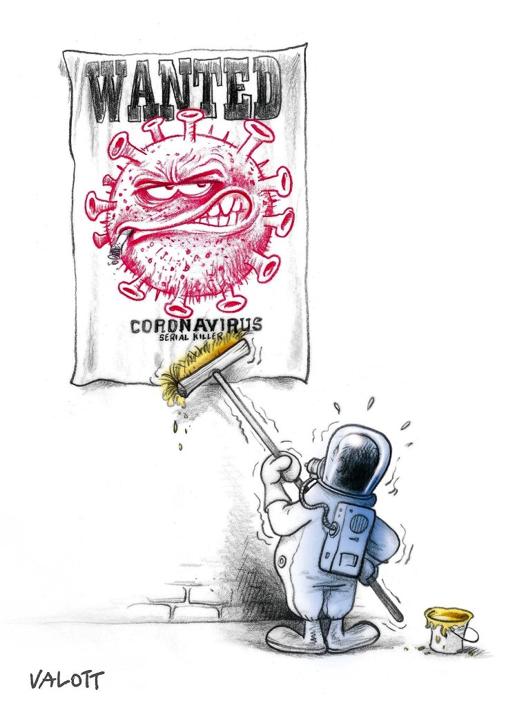 A partir de mars 2020, l’épidémie et son macabre cortège de milliers de personnes infectées et des milliers de morts ont envahi le champ de l’actualité reléguant au second plan les autres informations. Toutes les chaînes de télévision, toutes les stations de radios, tous les journaux, tous les réseaux sociaux ont, jour après jour, suivi les ravages du virus et focalisé leur attention sur les recherches le concernant, sur les modes de propagation, sur les symptômes, sur les gestes-barrières, sur les avancées des laboratoires pour mettre au point un vaccin. Impossible dans ces conditions de ne pas « parler » de la Covid 19. Valott ne pouvait pas ne pas en faire le sujet principal de ses dessins. Et cela pendant plusieurs mois. Jusqu’à une relative décroissance du nombre des personnes infectées et des décès.