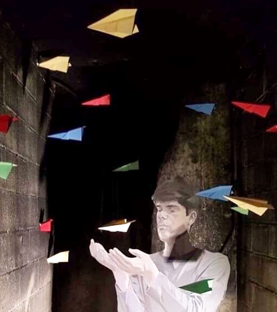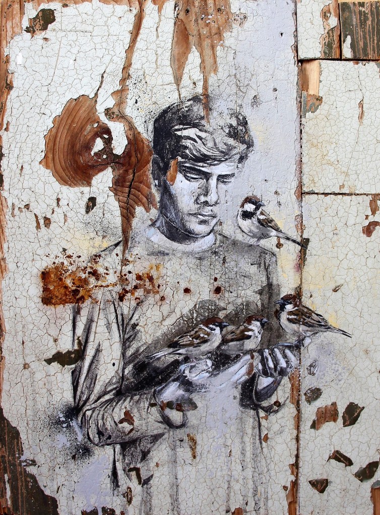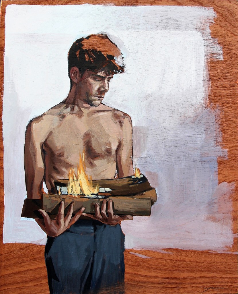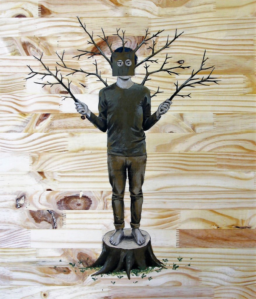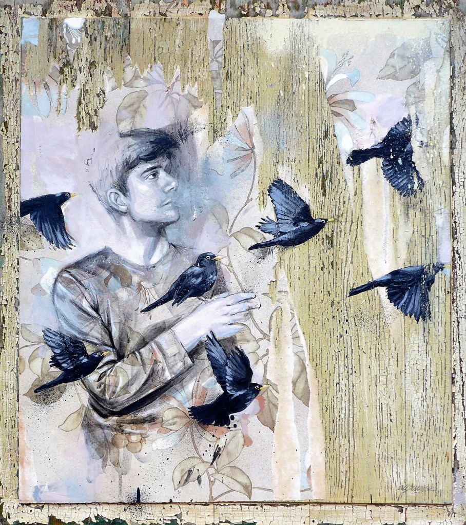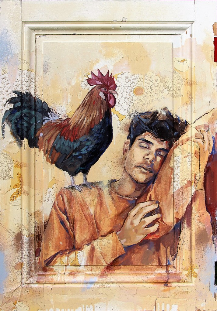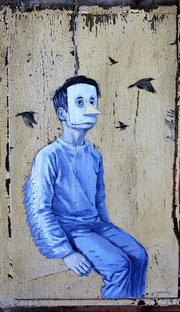 Peu à peu, les ombres cèdent la place à la lumière. A cette émergence correspond la disparition progressive de ce que j’ai nommé les « occultants ». Le visage et le corps de l’artiste apparaissent. Cela ne signifie pour autant que ce sont des autoportraits « classiques » ! Les œuvres d’Agrume sont des compositions d’un authentique raffinement. Entrent dans la relation au sujet des oiseaux, des fleurs, des poissons, des clés, des artichauts, un vase, un arbre, un feu (variante allumette), une femme etc. Dans la représentation du feu, ce n’est pas la forme des flammes qui est mise en avant mais la lumière générée par la combustion du bois. Le thème du feu est une déclinaison de la survenue de la lumière. Une lumière qui éclaire la palette du peintre qui ose des couleurs vives.