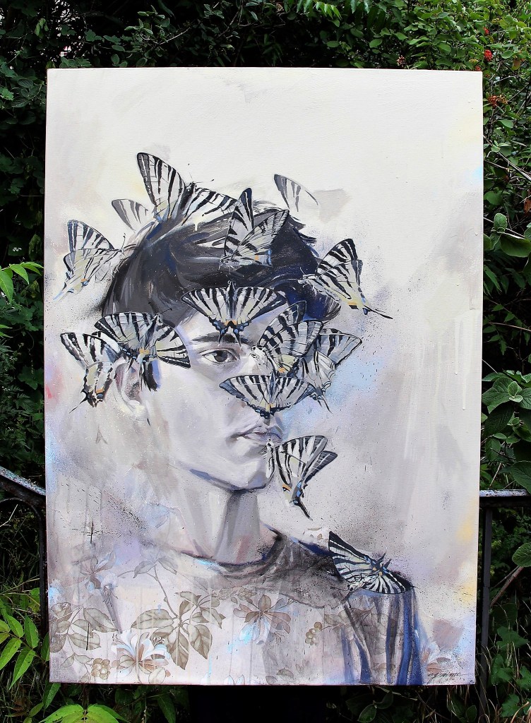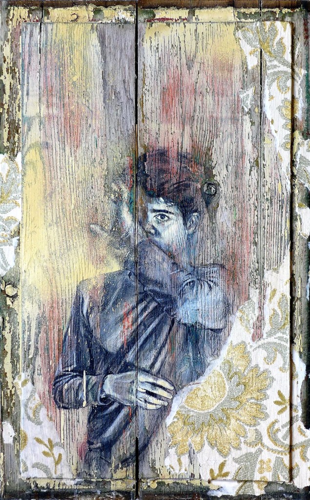 Interrogé sur le surgissement de la lumière et le changement de la palette, Agrume propose une explication : « La présence de la lumière dans mes tableaux croît en effet, cela vient sans doute de l’évolution de mon travail et de mon regard avec le temps. Cela vient aussi de ma technique qui change et s’améliore. J’ai pendant un temps beaucoup travaillé à partir de supports préexistants, par exemple des tapisseries anciennes, mais aussi des supports en bois, vieillis par le temps. Tous ont en commun les traces du temps passé, des effacements, des marques, un caractère déjà fort, une certaine « patine ». Ces supports me servant de base de travail et de fond fixent une ambiance de départ, leurs caractères passés inclus des couleurs parfois cassées par le temps et un manque de lumière (…) Je remarque également que la lumière présente dans mes tableaux est directement corrélée à la lumière dans laquelle je vis et à la présence du soleil. Mon travail d’hiver sera un peu moins lumineux avec des couleurs plus froides. Celui du printemps et de l’été présentera plus de lumière et de couleurs. »