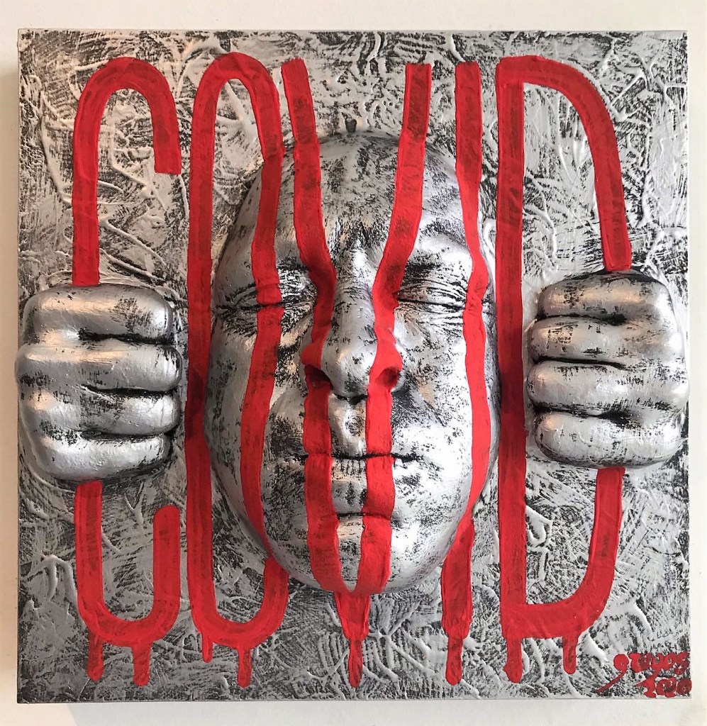 De cette analyse sommaire des œuvres de confinement et de déconfinement je tire deux enseignements essentiels : la monde est désormais un village et les expressions plastiques de nos inquiétudes traversent les frontières et les continents. A un point tel qu’il est difficile de saisir les déclinaisons que les sociétés font de leurs peurs.