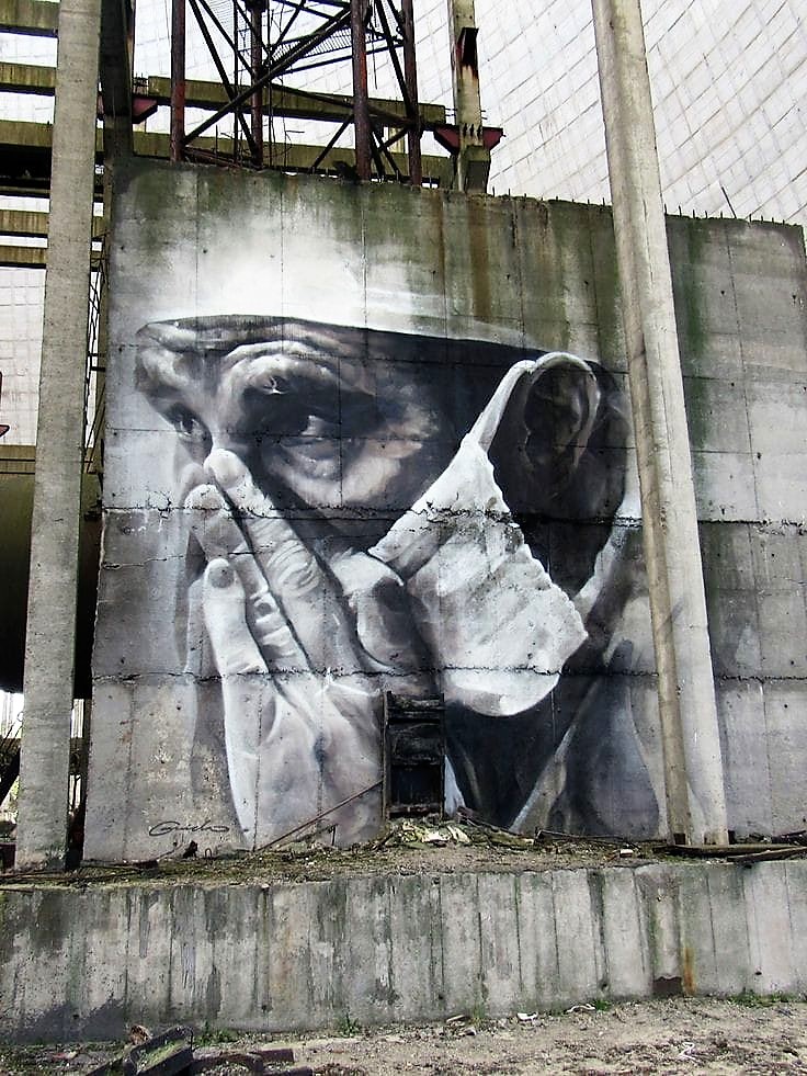 A l’inverse, un petit nombre d’œuvres illustrent la peur et la nécessité de se protéger. Le registre a changé et le regardeur est invité à partager l’angoisse de l’enfermement et celle du médecin qui ne peut proposer à ses patients ni traitement ni rémission. Les fresques sont graves et sombres. Les artistes n’ont guère exagéré le trait. Le caractère sérieux des œuvres est marqué par la retenue. La forme, la palette, la composition, le lettrage, sont dans le droit fil de cette sobriété. L’allusion, l’hyperbole, la symbolique évitent la violence des évocations.