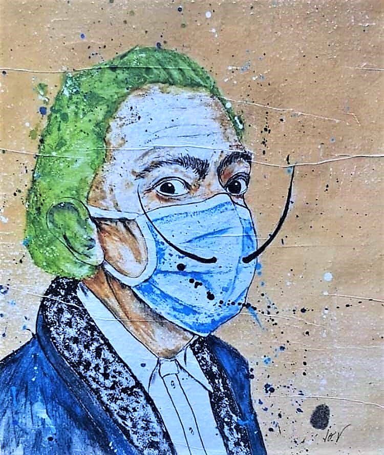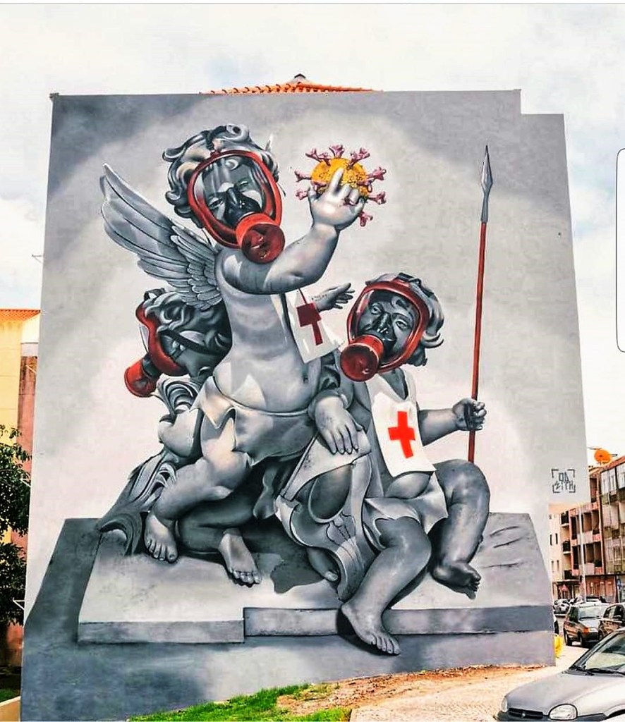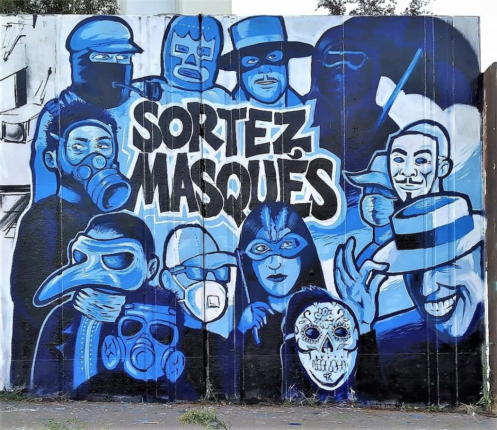 Les œuvres humoristiques sont légion. Elles s’amusent des masques, des masques que l’on porte, ceux qui sont jetés, de la représentation désormais bien établie du virus, de l’obligation qui nous a été faite de rester confinés. Les œuvres dans la rue sont complétés par les dessins de presse et les illustrations. L’ensemble, en nombre, si ce n’est en qualité, est impressionnant. Il témoigne de la fonction cathartique du rire comme soupape à nos peurs et nos angoisses. Représenter ce qui nous terrifie est une façon de le mettre à distance. Dessiner, peindre le virus (ou du moins sa représentation désormais « classique », c’est l’identifier et, par-là, la possibilité de le voir et de le nommer. Rien n’est plus angoissant qu’un mal qui n’a ni nom ni image.