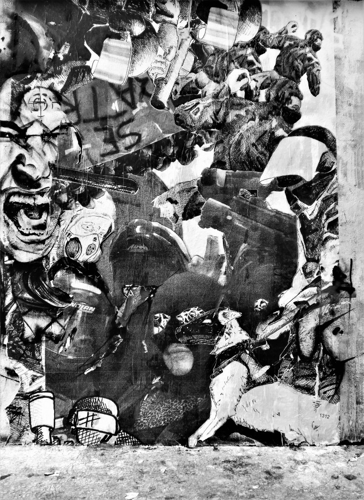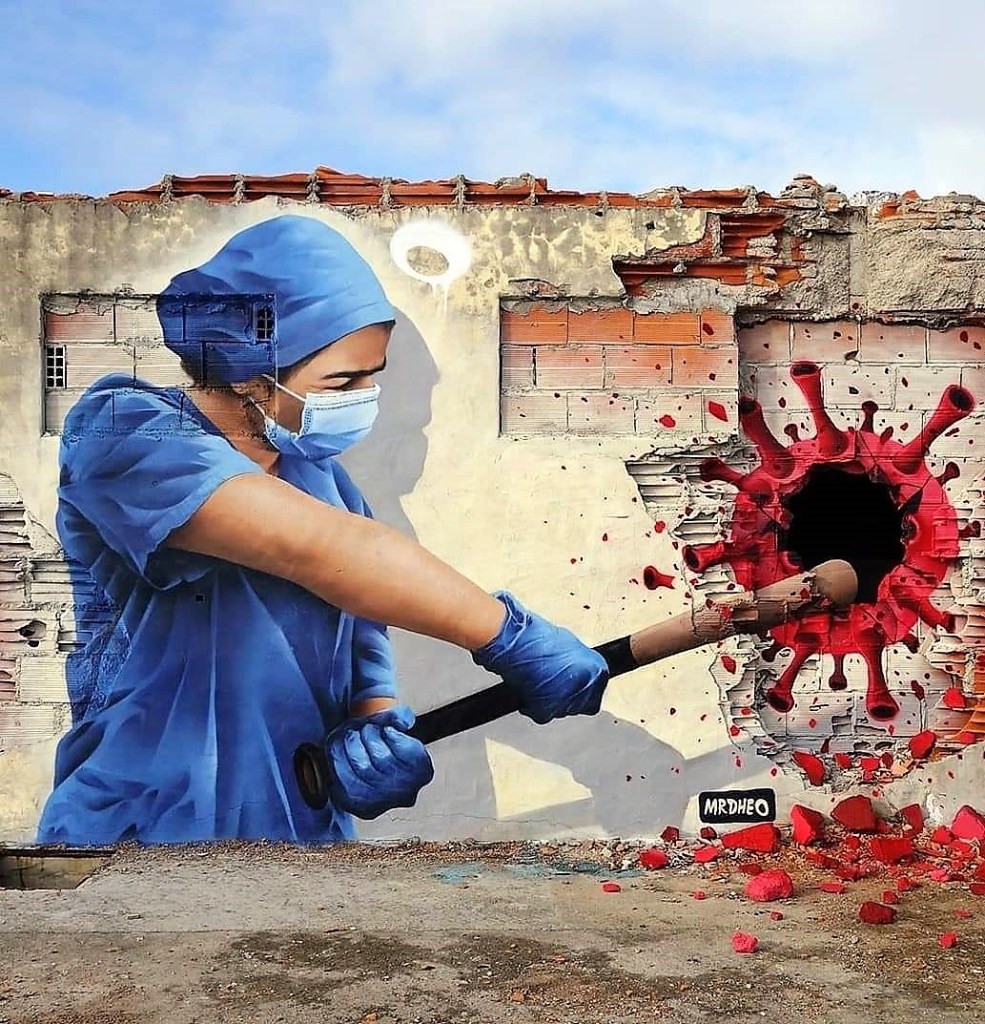 La séquence que nous vivons, du point de vue de sa traduction dans les œuvres de street art, a des points communs avec la première et des différences significatives. Nous retrouvons, traduit sensiblement de la même manière, un hommage aux soignants et cela dans tous les pays et une explosion d’œuvres plus légères voire comiques. Un humour pondéré par un regard grave sur la pandémie et ses conséquences. Un thème a été renouvelé, les relations entre l’épidémie et le contrôle des citoyens par les états.
