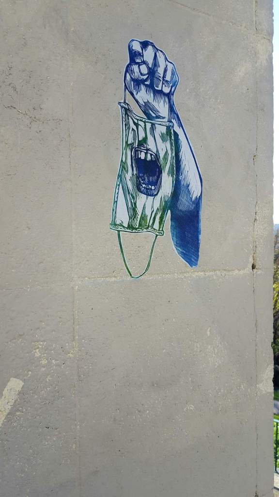 Des œuvres politiques abordent le contrôle de la société par les exécutifs. IL est vrai que le masque imposé à tous peut être vu symboliquement comme un bâillon qui empêche l’expression des mécontentements et des revendications. Par ailleurs, le croisement de la crise sanitaire et le vote de loi sur la sécurité globale est compris par certains comme des moyens pour limiter les libertés individuelles et un pas de plus vers un état autoritaire.